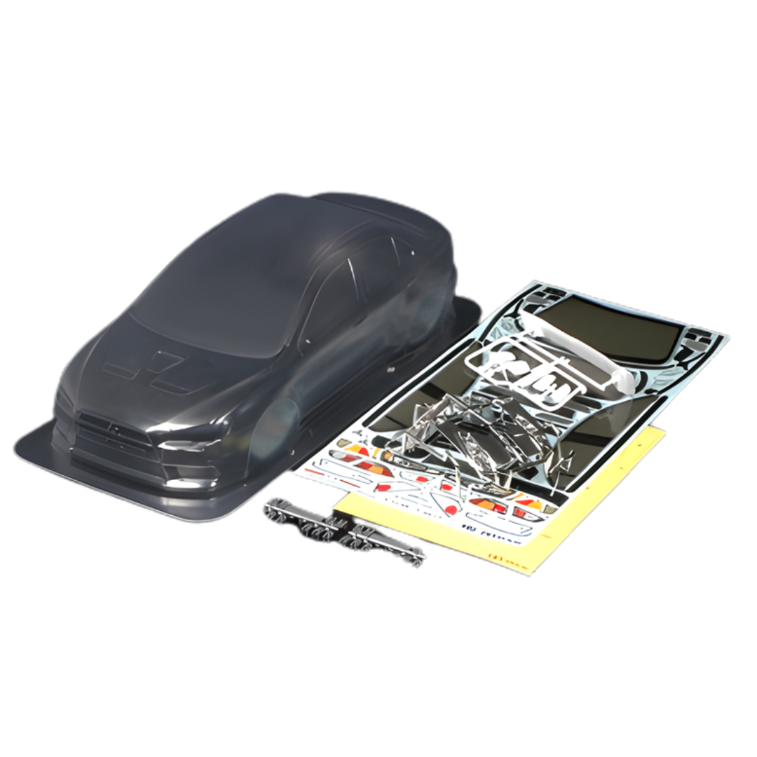 This Tamiya Mitsubishi Lancer Evolution X clear body set accurately captures the bold styling of the Evo X. Moulded from durable polycarbonate, it is ideal for 1/10 touring and rally chassis and offers multiple light mounting positions for enhanced realism.