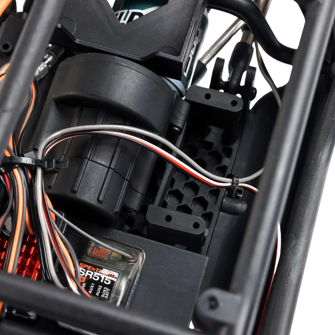 - Factory-installed oversized Axial Boulder 550 21-turn brushed motor
