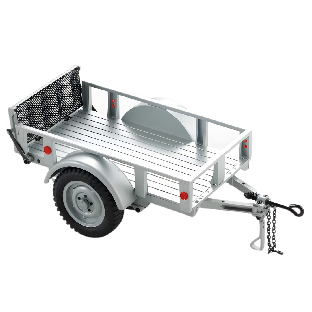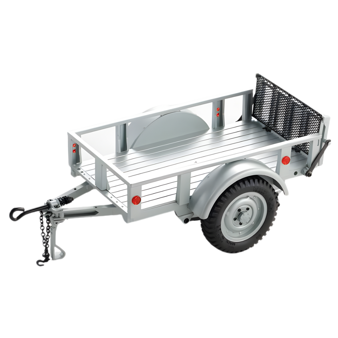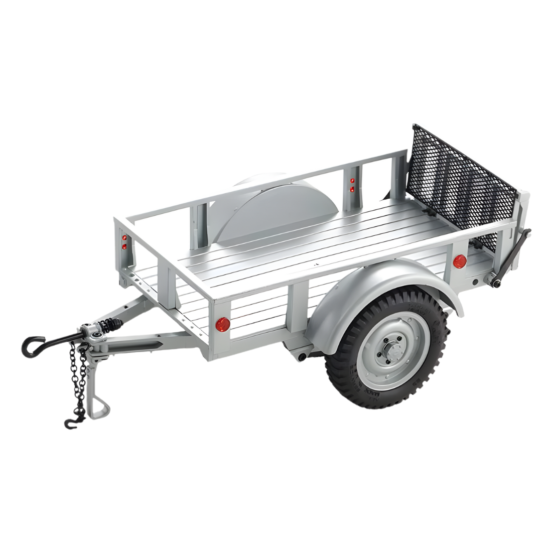 The FMS Utility Trailer B in grey is a versatile accessory designed for 1/18 and 1/12 scale RC vehicles. It adds functional hauling capability and enhances scale realism for your RC setup.