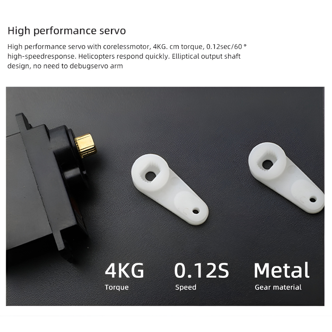 - Responsive servo system: Coreless motor with 4KG torque and 0.12s speed