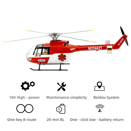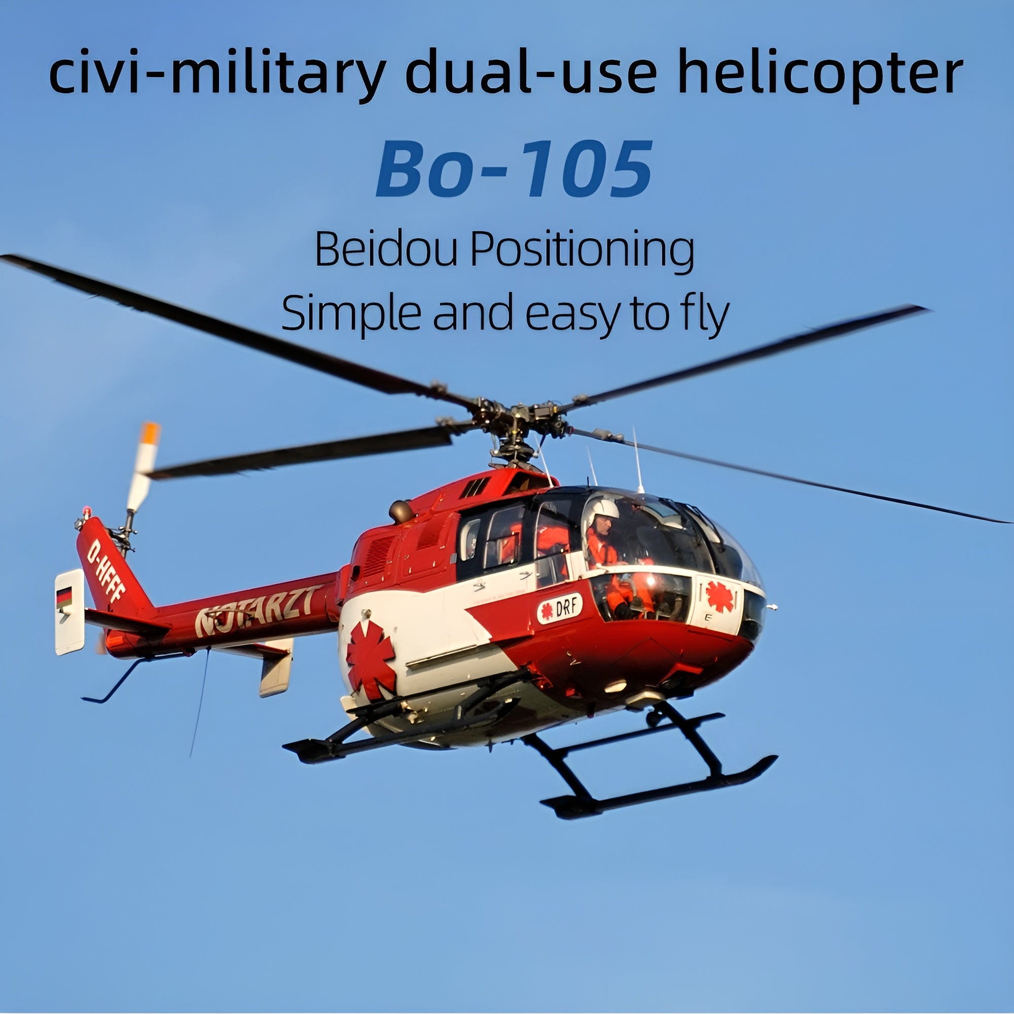 The Flywing BO-105 is a precision 6-channel GPS RC helicopter with a 450L scale fuselage and four-blade rotor system, offering authentic design, stable flight control with H1 system, and high realism for collectors and enthusiasts.