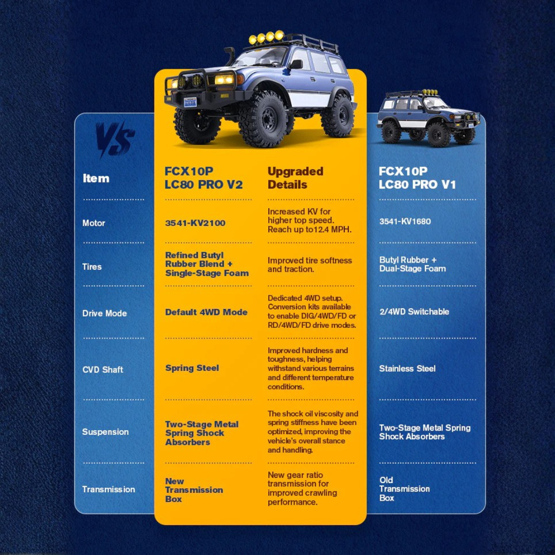 The FMS FCX10 PRO FMS11061RSBU-PRO2 Toyota Land Cruiser LC80 V2 sets a new benchmark in 1/10 scale brushless RC crawlers. Combining scale realism with pro-grade performance, it features an officially licensed LC80 body, remote-locking diffs, two-speed transmission, portal axles, and a powerful 3541-KV2100 brushless system. Built on the upgraded FCX10 P chassis, this crawler is ready for extreme terrain with improved electronics and a high-torque 25kg servo.