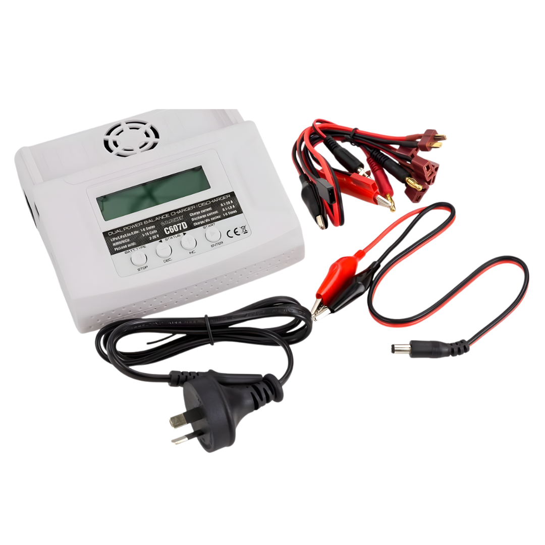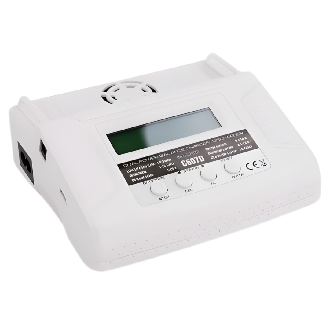The G.T. Power C607D is a compact yet powerful AC and DC smart charger designed to safely charge, balance, discharge, and cycle a wide range of battery types, making it ideal for home use or field charging.