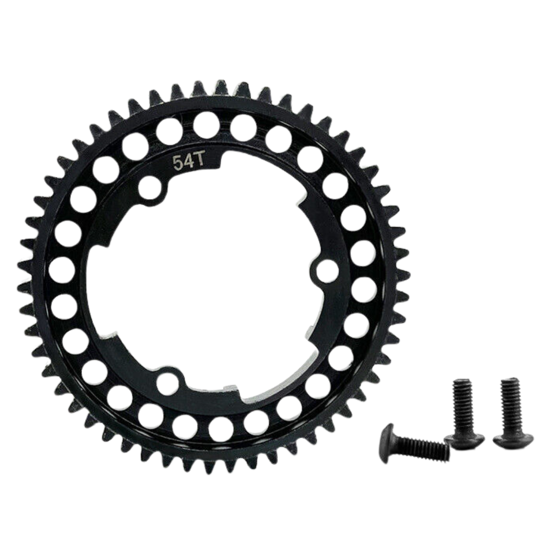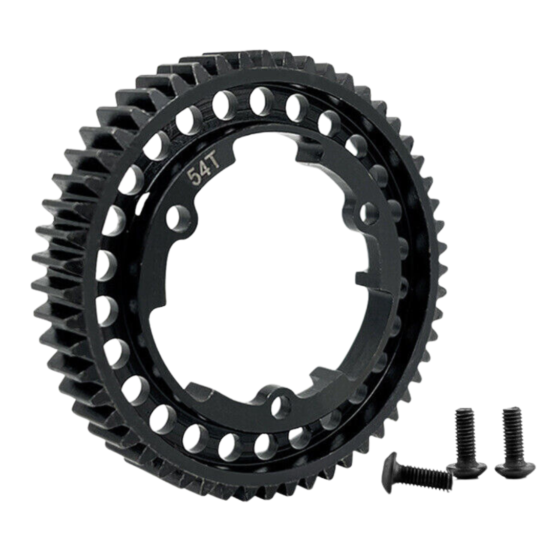 This hardened steel 54T main spur gear is designed for high-performance RC applications, providing superior strength and wear resistance for Traxxas X-MAXX and XO-1 models using Mod 1 gearing.