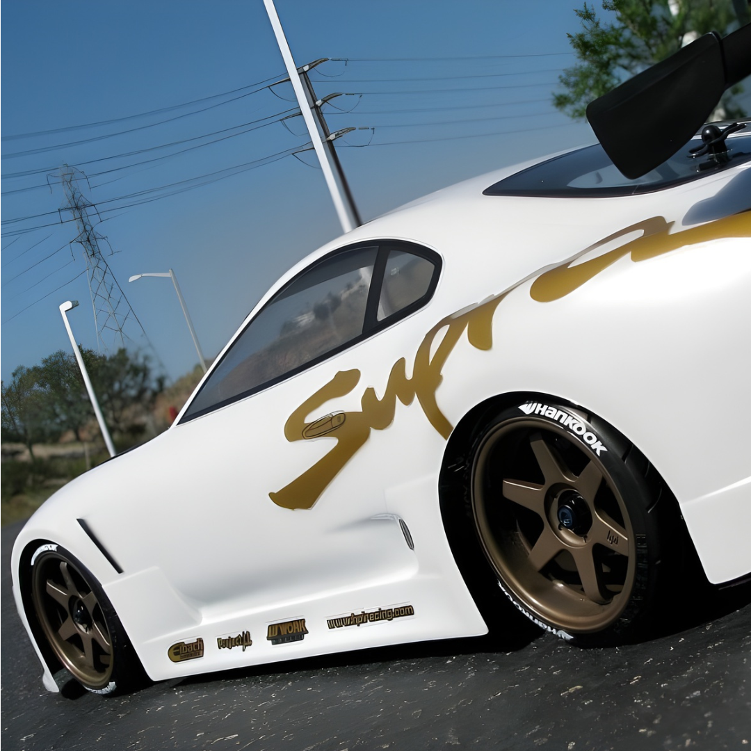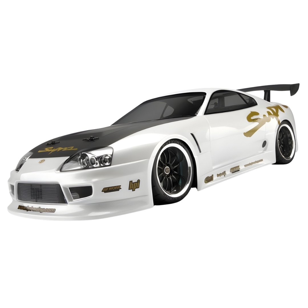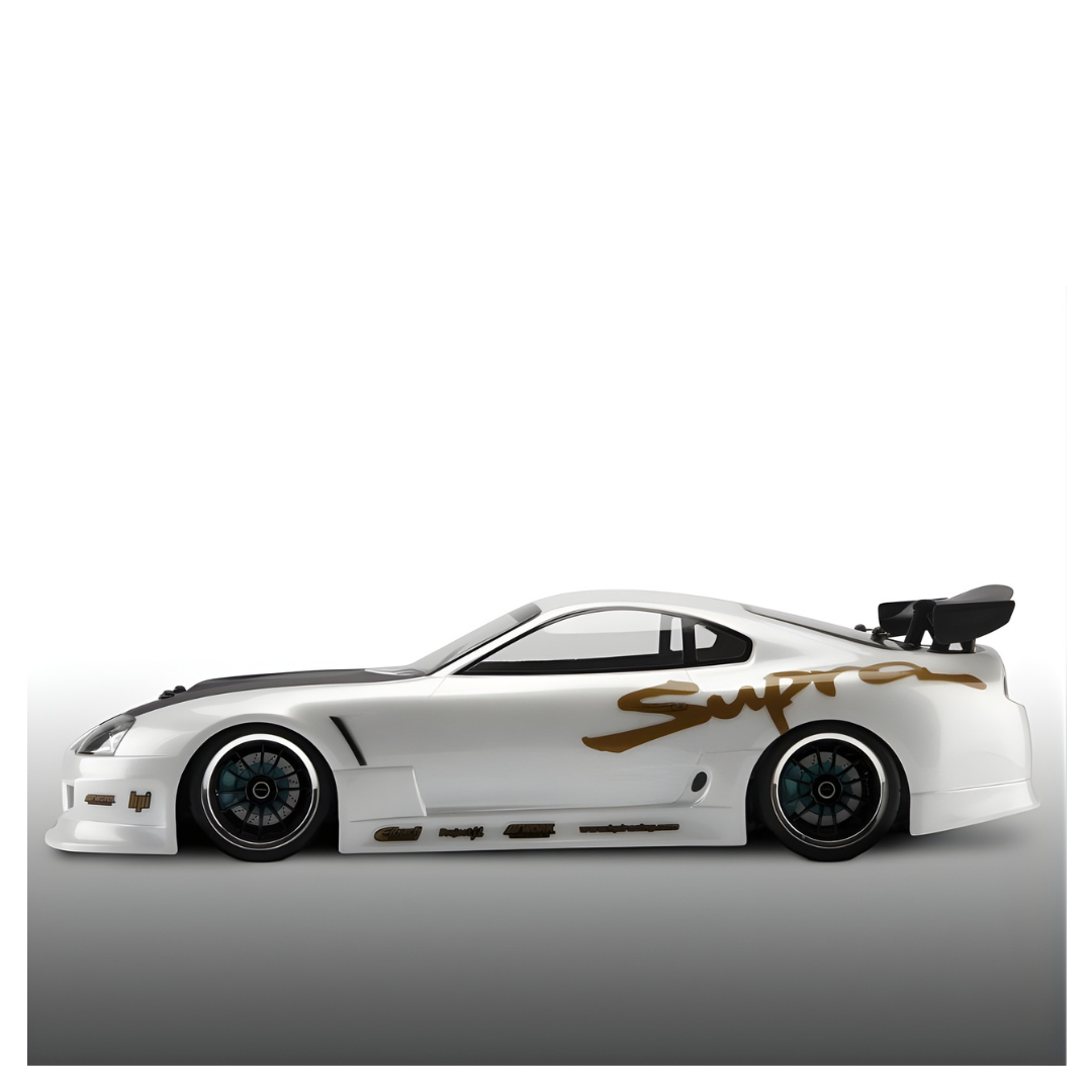 The HPI Toyota Supra Aero body brings aggressive JDM tuner styling to your 1/10 scale touring car. Featuring custom aero panels and an officially licensed Supra design, this clear polycarbonate body is ideal for drifting, racing, or high-performance street setups and offers excellent durability and scale realism.