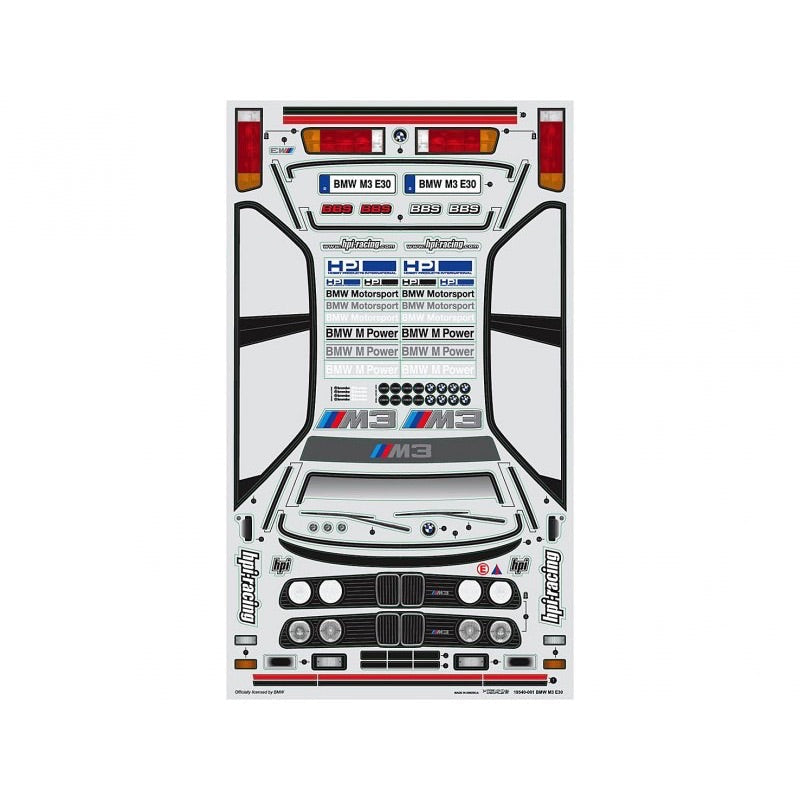 HPI faithfully recreates the BMW M3 E30 for R/C cars with this 200mm body that fits wide 1/10 scale sedans and features the usual HPI attention to detail. Included with the body is a pre-cut decal sheet that include window lines, headlights, grills, tail lights, official logos and much more, providing your touring car with a realistically finished product. This body is clear so you can paint it in your favourite colours. It fits 200mm touring cars and can also be used on 190mm touring cars with the use of wide offset wheels. Overspray film is included, as well as vinyl window masks to make painting quick and simple. An instruction sheet is included for the decals, and the body has dimple marks for body post drill locations.