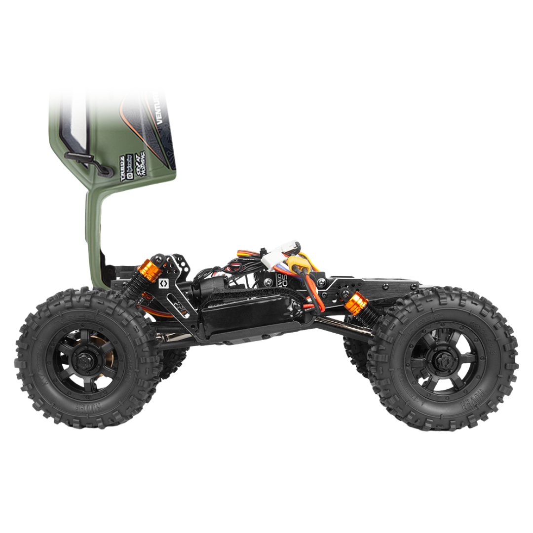 The HPI Venture18 CC Flux is a high-performance 1/18 scale competition crawler built for technical terrain and compact adventures. Featuring a centre servo-operated half-DIG transmission, front overdrive gears, brass beadlock rings, and a fully detailed Ridgeline Half Cab body, it's ready to tackle demanding trails straight out of the box. With a 2mm machined aluminium chassis and 3S brushless power, this mini crawler delivers big capability in a small footprint.