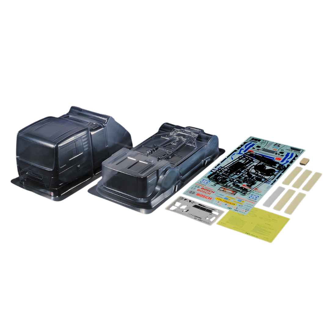This complete body set replicates the Team Hahn Racing MAN TGS Semi Truck, offering a durable and lightweight polycarbonate shell for your TT-01 Type-E or TT-02 chassis. The set includes detailed accessories and full sponsor decals for a realistic racing look.