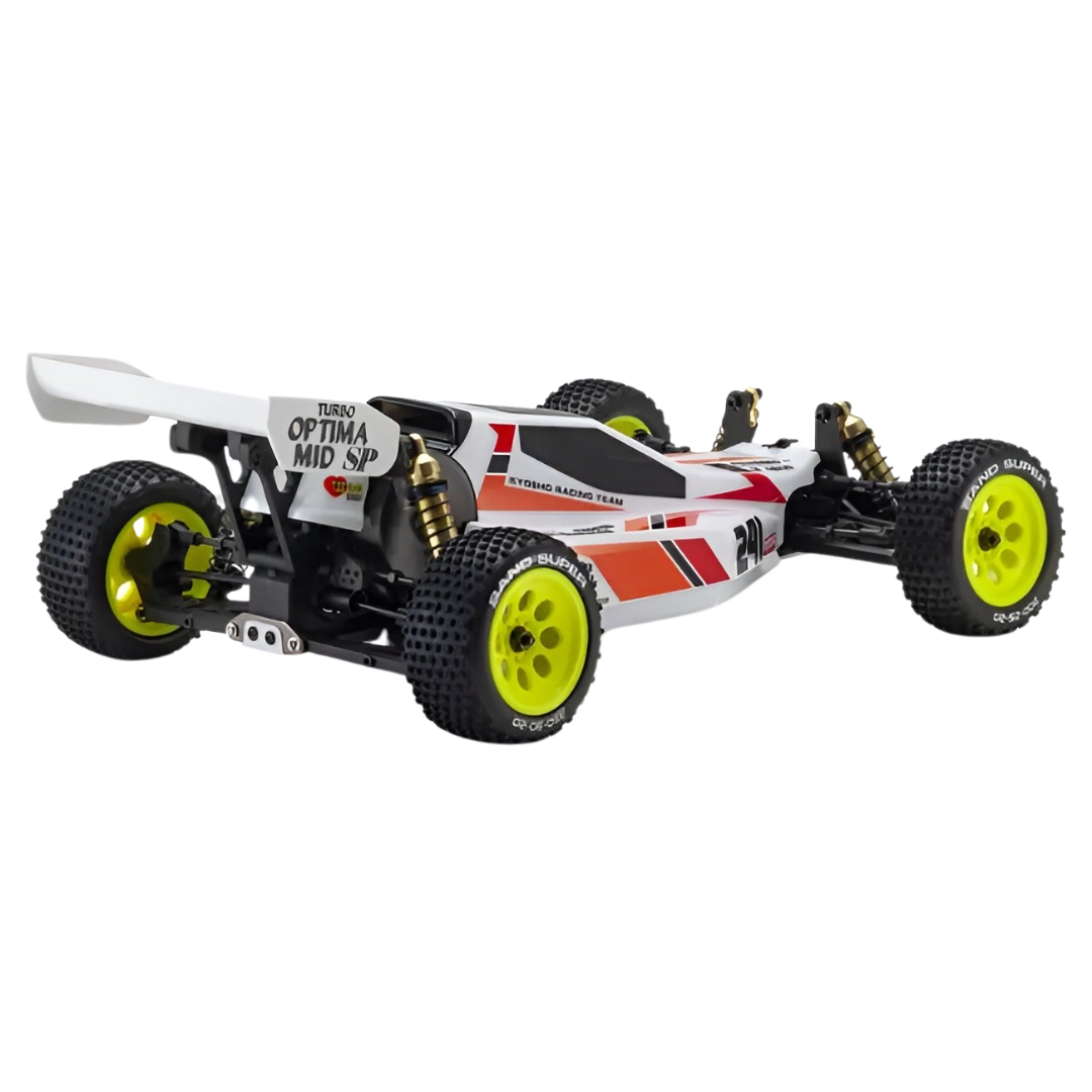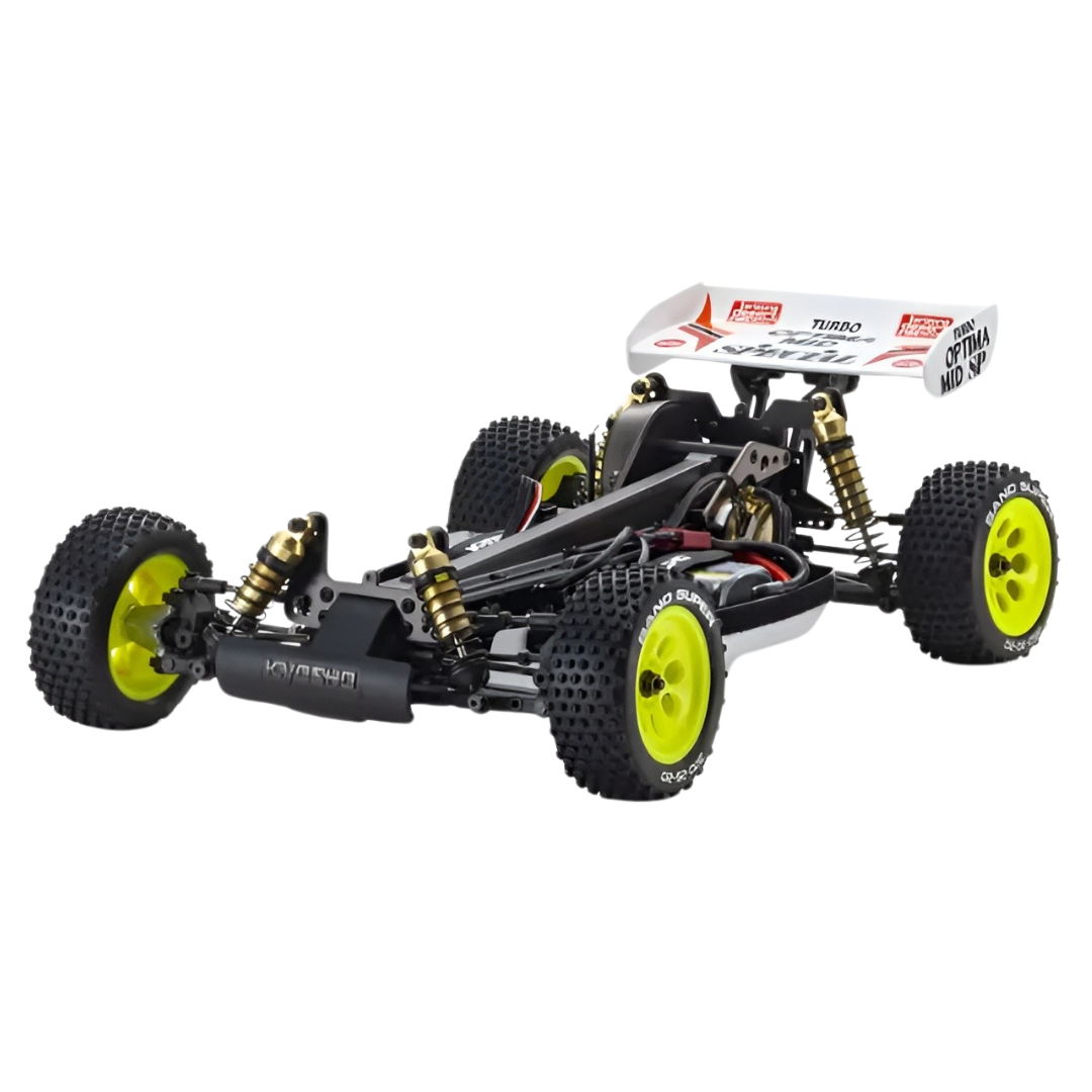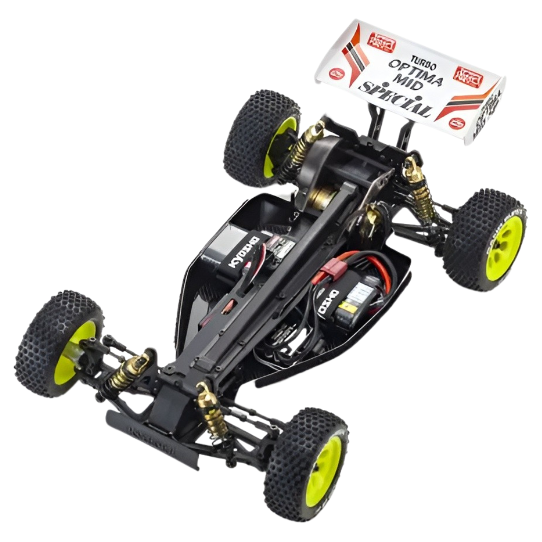 The Kyosho Turbo Optima Mid Special revives the legendary final form of the Optima Series in 1/10 scale with modern enhancements. Featuring a 4WD belt drive system and precision engineering, this electric racing buggy delivers competitive performance on and off the track.