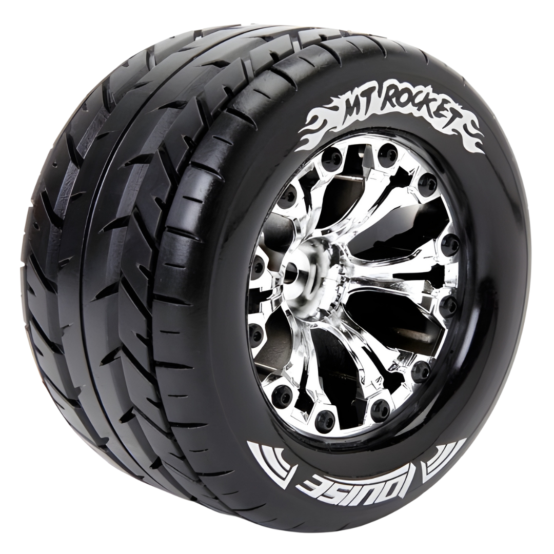 The MT-Rocket tyre on chrome rim with a 1/2 inch offset is designed for a range of 1/10 scale RC trucks. Featuring a soft tire compound and durable chrome nylon wheel finish, this set offers superior traction and a stylish appearance for both on-road and off-road applications.