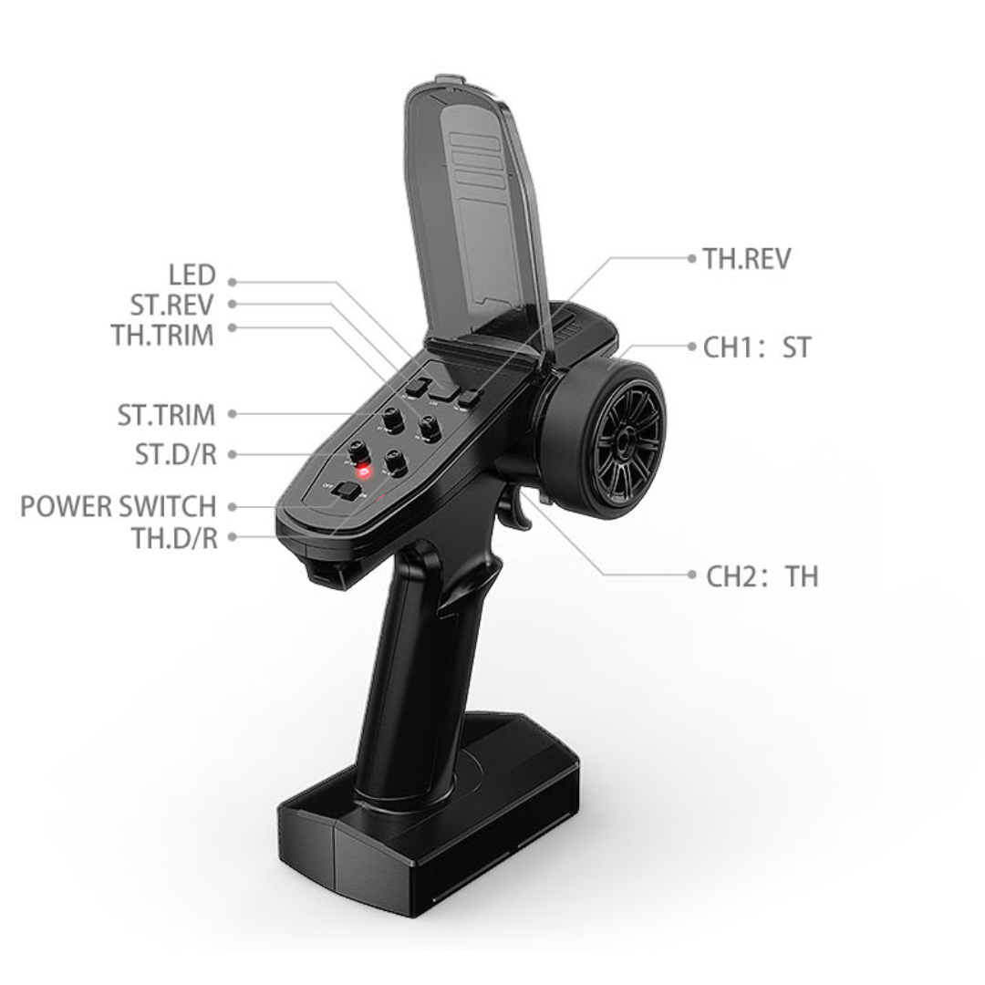 - Transmitter: 2.4GHz (requires 2x AA batteries, not included)