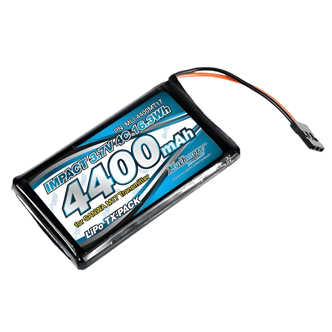 The Muchmore Impact 4400mAh 3.7V LiPo battery is purpose-built for the Sanwa M17 radio, offering extended runtime, lightweight design, and a perfect fit. With a 4C discharge rate and high-quality 20AWG silicone wiring, this pack ensures reliable and efficient performance for serious racers.