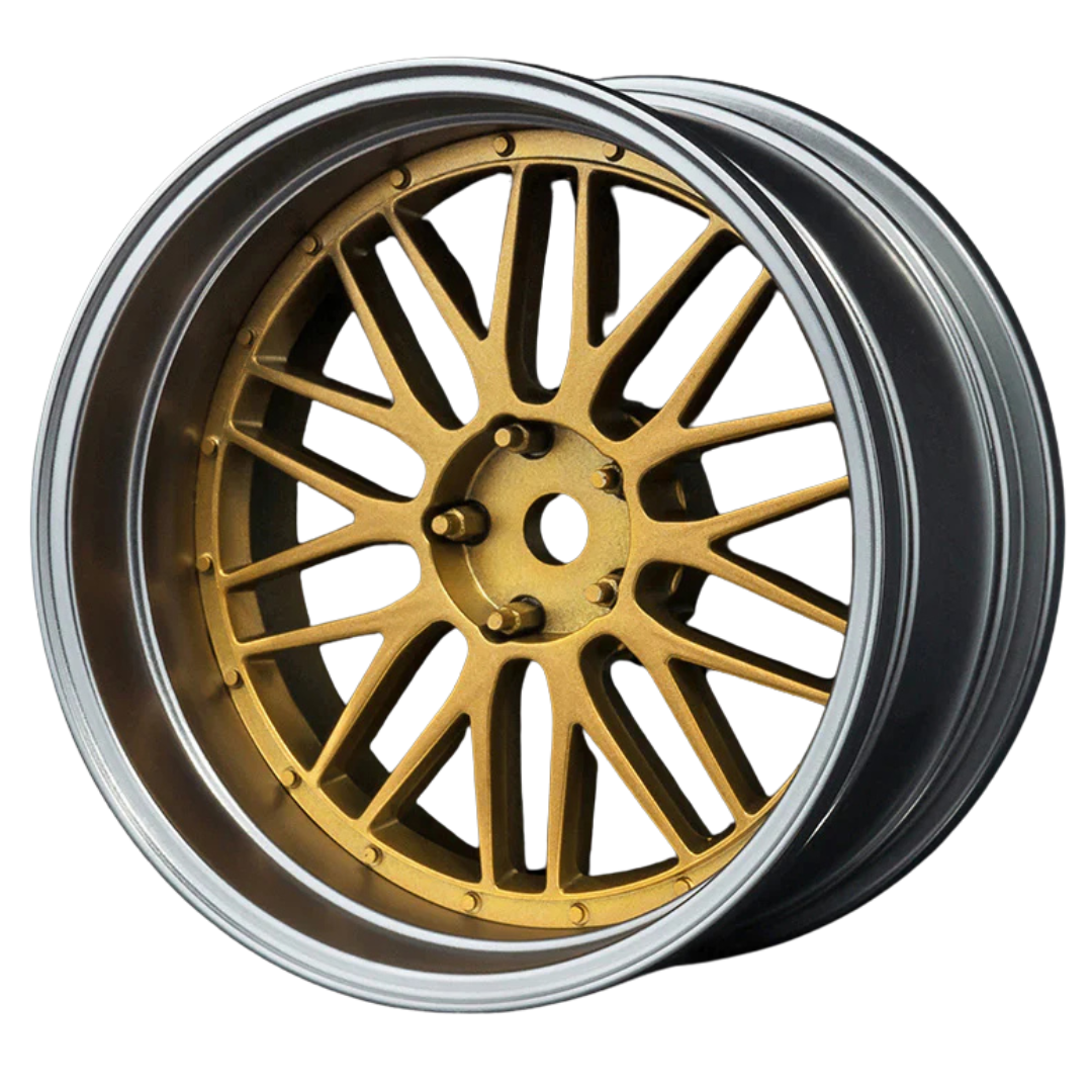 Versatile wheel set designed for 1/10 drift and touring cars, featuring an adjustable offset system for customised fitment and performance. Finished in a stylish flat silver and gold colour combination.