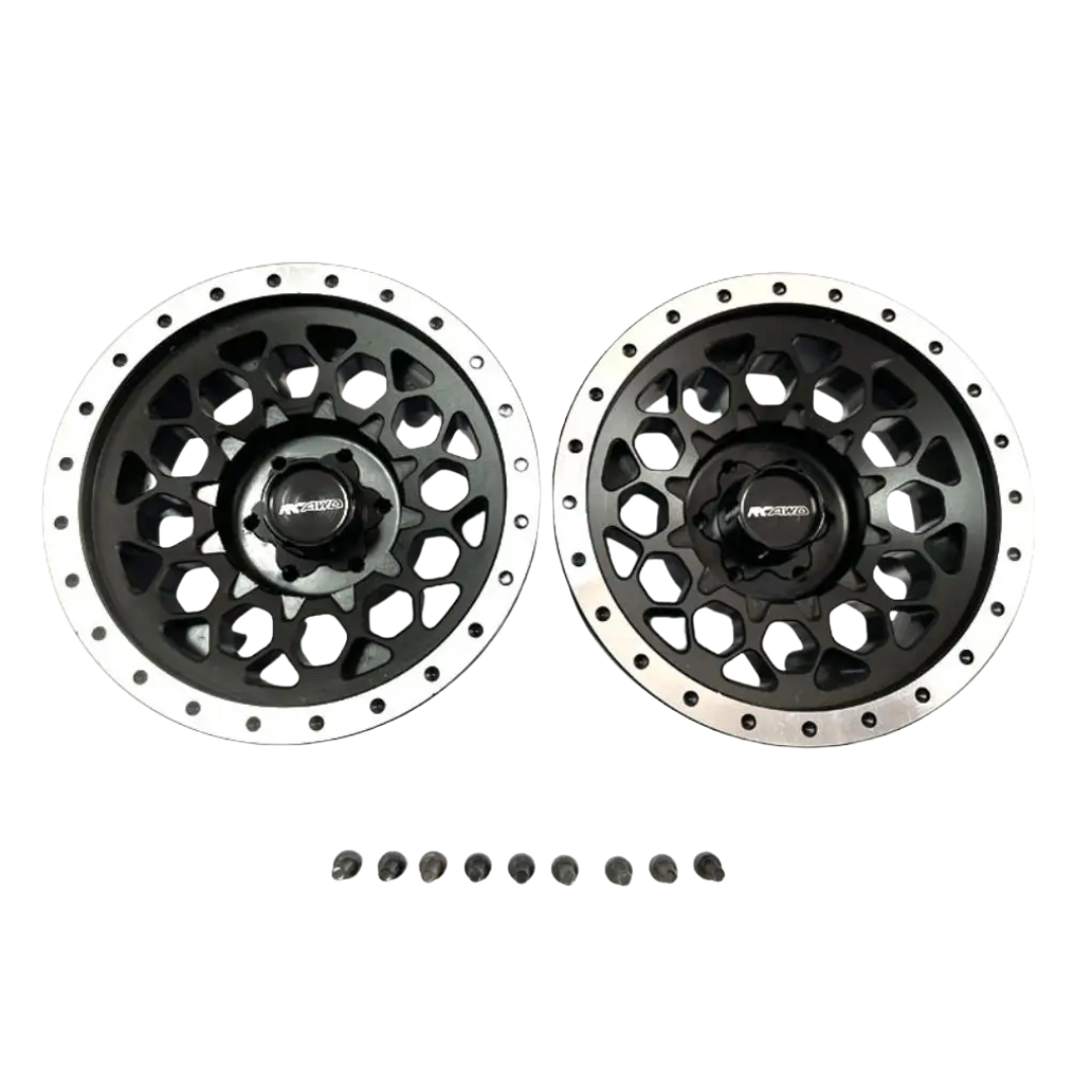 These 1/6 scale aluminium alloy beadlock wheel rims are designed for compatibility with Axial SCX6 RC cars. Built for durability and performance, they enhance suspension response and provide a secure, glue-free fit.