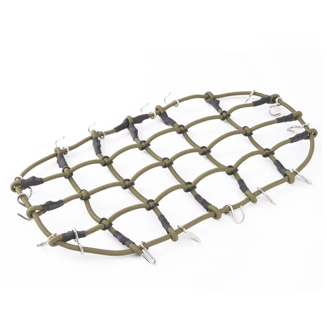 The OZRC elastic luggage net is a detailed scale accessory designed for securing roof rack items on 1/10 RC crawlers, enhancing both realism and utility for display or light-duty use.