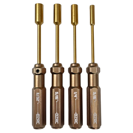 The OZRC 4-piece imperial nut driver set features high-strength hardened steel tips and lightweight alloy handles, offering excellent grip and durability for RC maintenance and assembly tasks requiring imperial sizing.