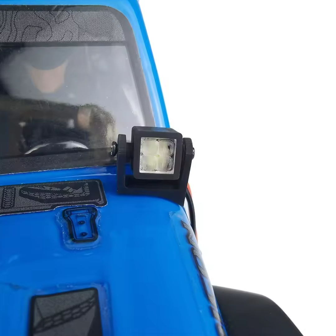 Compact and stylish LED square spotlight set designed to enhance visibility and scale realism on 1/24 Axial SCX24 Jeep Gladiator and Wrangler RC crawler cars.