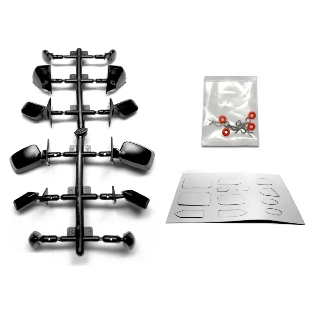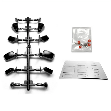 Customisable side-view mirror set for 1/10 scale RC cars and trucks, offering six different styles with mirrored decals for added scale realism. Suitable for on-road, off-road, drift, and touring applications.