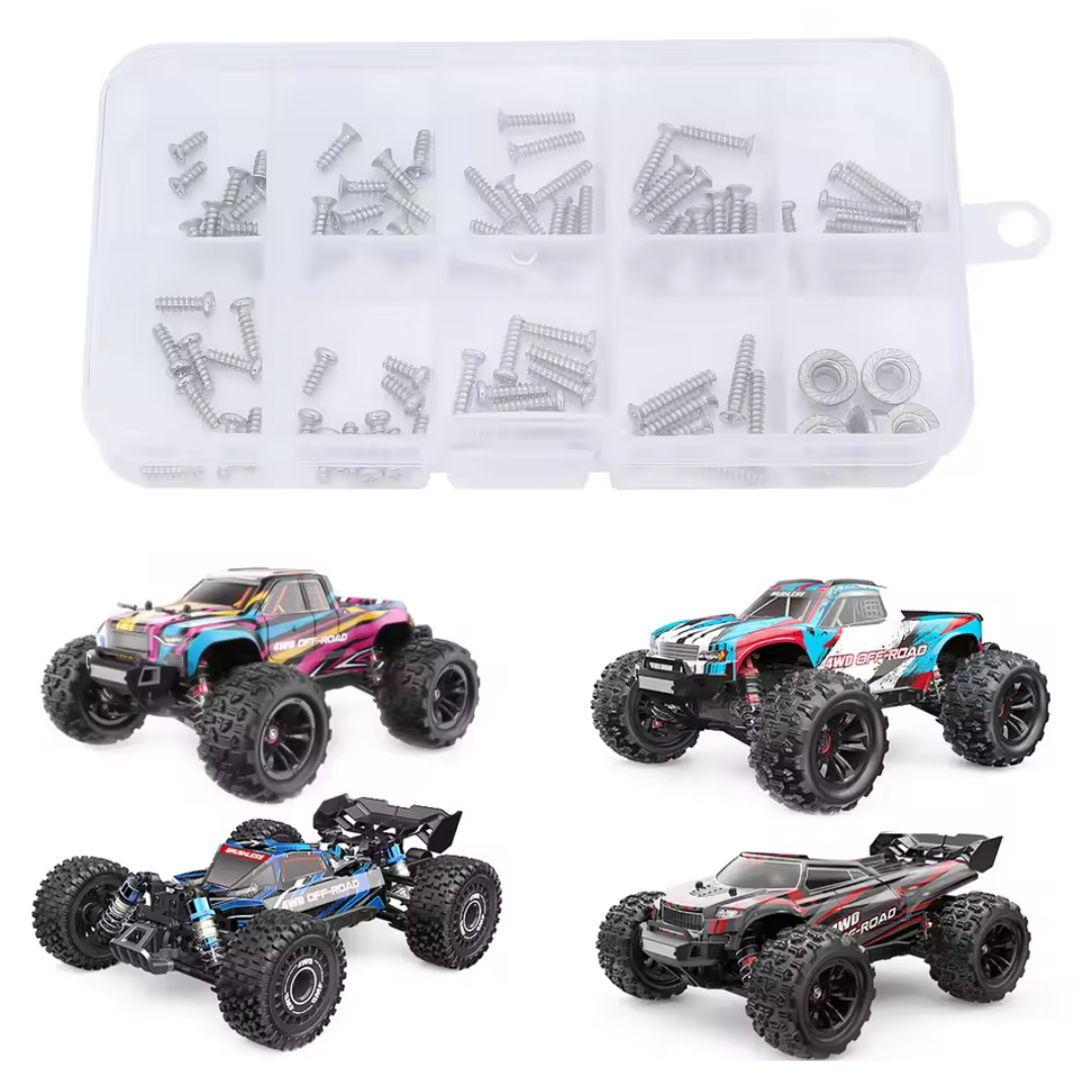 Comprehensive stainless steel screw set by OZRC, designed for MJX Hyper Go 1/16 RC models including 16207, 16208, 16209 and 16210. Ideal for repairs and upgrades, this kit includes high-grade fasteners in a compact storage box.