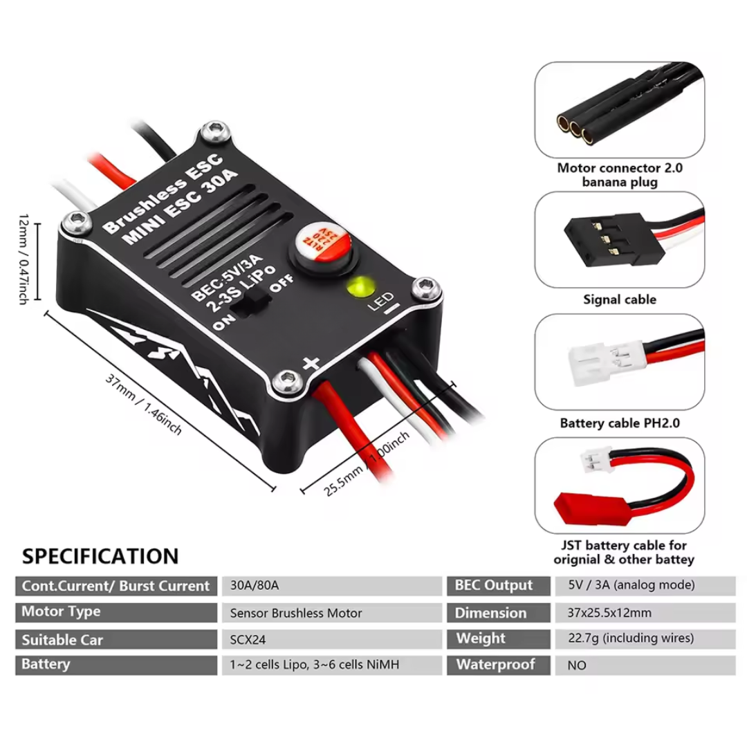 - ESC Dimensions: 37 x 25.5 x 12 mm