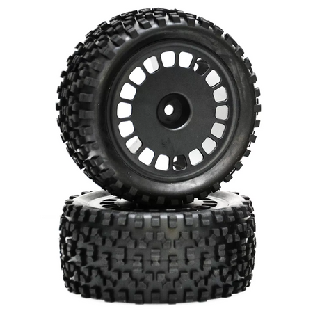 Durable 1/10 scale buggy tyre and rim set designed for Tamiya TT-02B and DT-02 RC cars. Featuring a special tread pattern for improved roadholding, these tyres are pre-mounted with foam inserts but not glued, allowing for easy customisation.