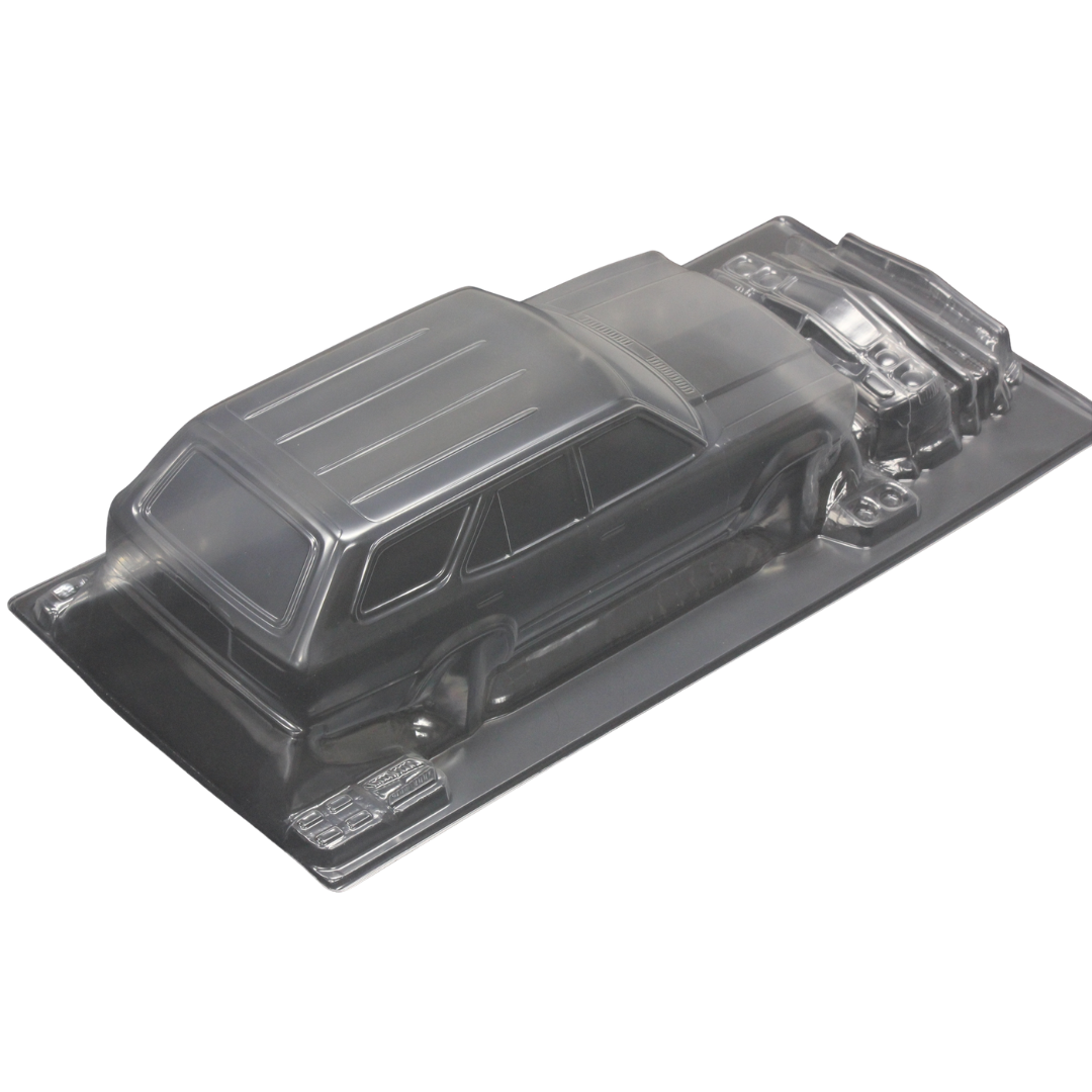 Realistic 1/10 scale clear body shell of the Mazda RX3 Savanna Sports Wagon, officially licensed by Mazda Motor Corporation. Made in Japan from durable polycarbonate, this unpainted body is ideal for collectors and RC drift or on-road enthusiasts looking to replicate vintage styling with detailed scale parts.