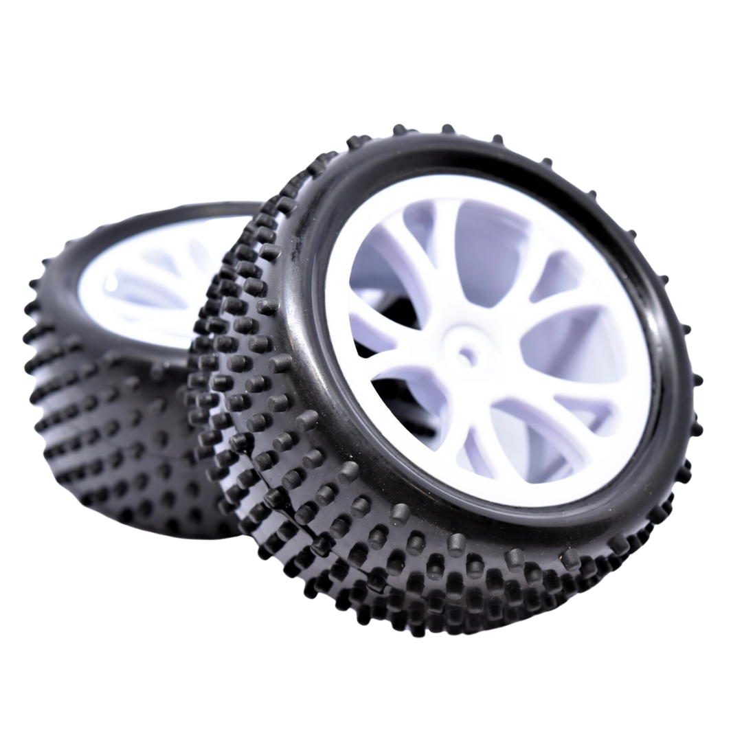 - 2 x Rear off-road buggy tyres (mounted on white wheels)