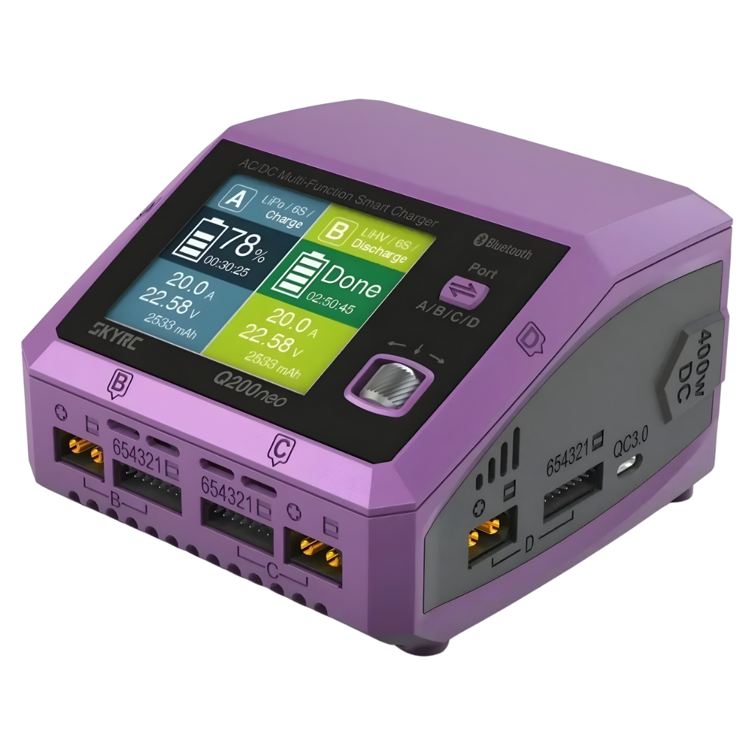 The SkyRC Q200neo is a high-performance quad port smart charger ideal for RC enthusiasts. It supports both AC and DC input and offers up to 400W of total output with simultaneous multi-battery charging, delivering fast, accurate and efficient charging with smart balancing capabilities.