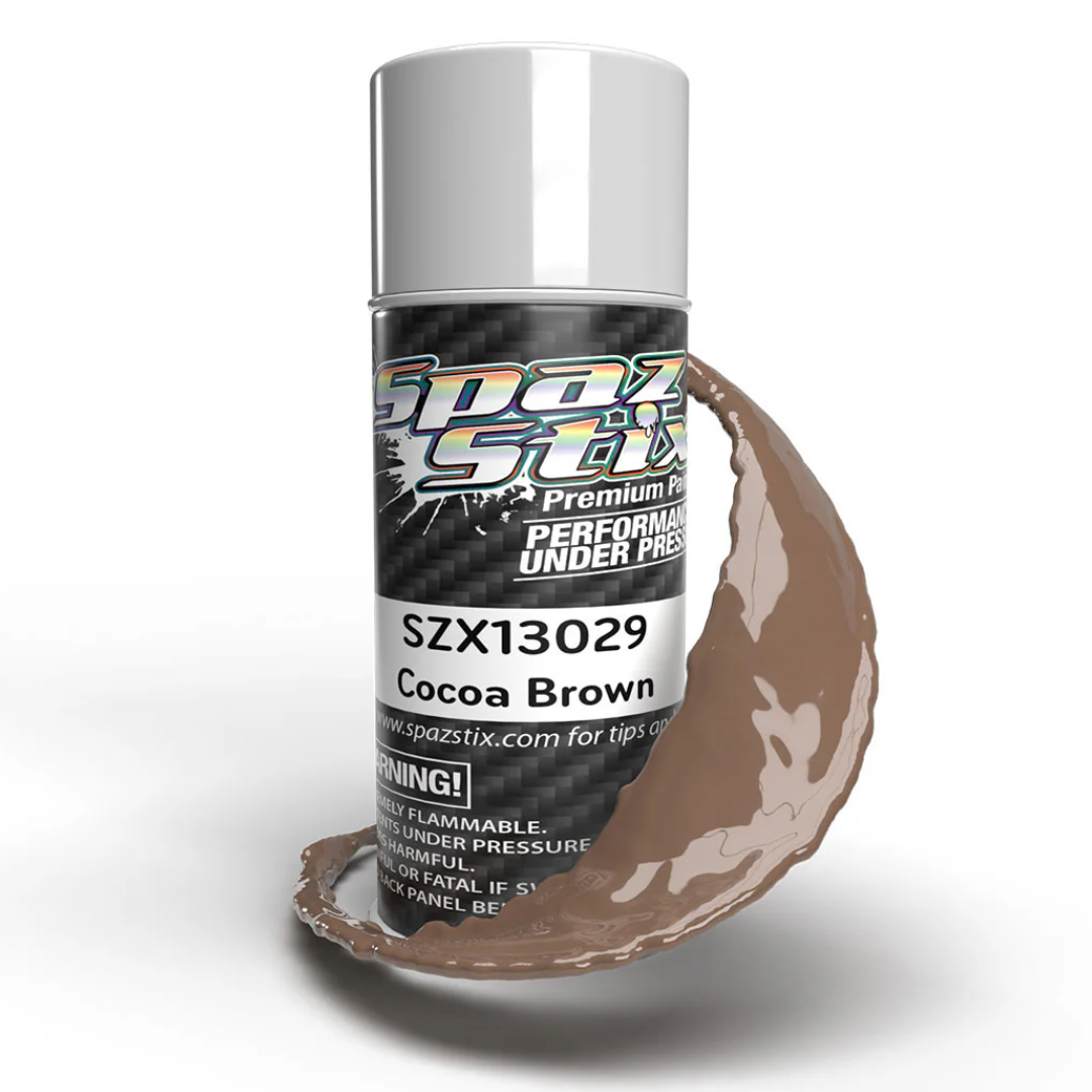 Premium enamel-based aerosol paint in cocoa brown, part of the Spaz Stix "Solids" range. Delivers brilliant opaque colour with excellent coverage, ideal for RC bodies and a wide range of hobby surfaces.