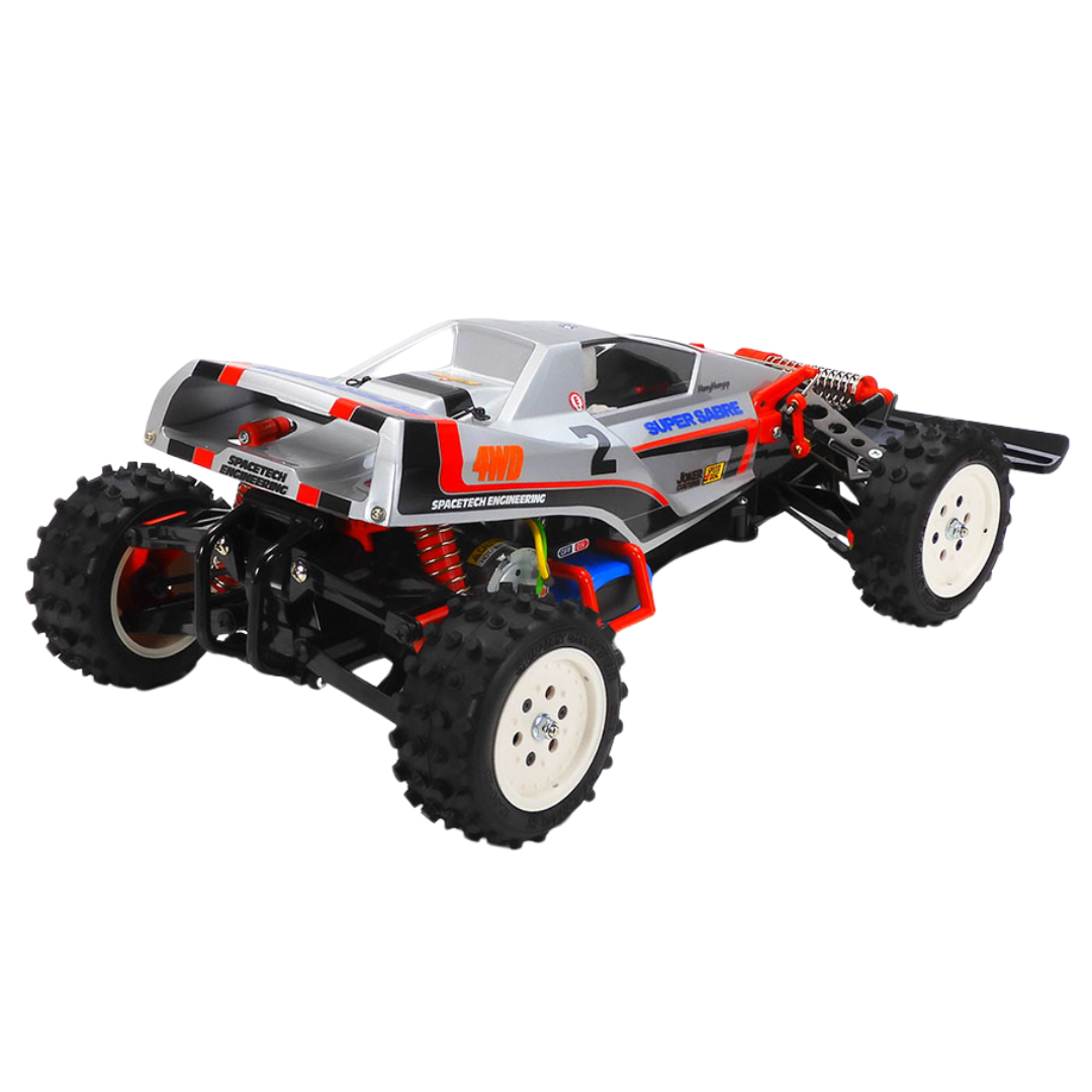 The Tamiya Super Sabre 1/10 RC is a 2023 re-release of the iconic 1987 model, blending retro style with modern enhancements. This shaft-driven 4WD buggy features CVA oil dampers, a bathtub frame chassis, and an aerodynamic pre-painted polycarbonate body for reliable performance across varied off-road terrain.