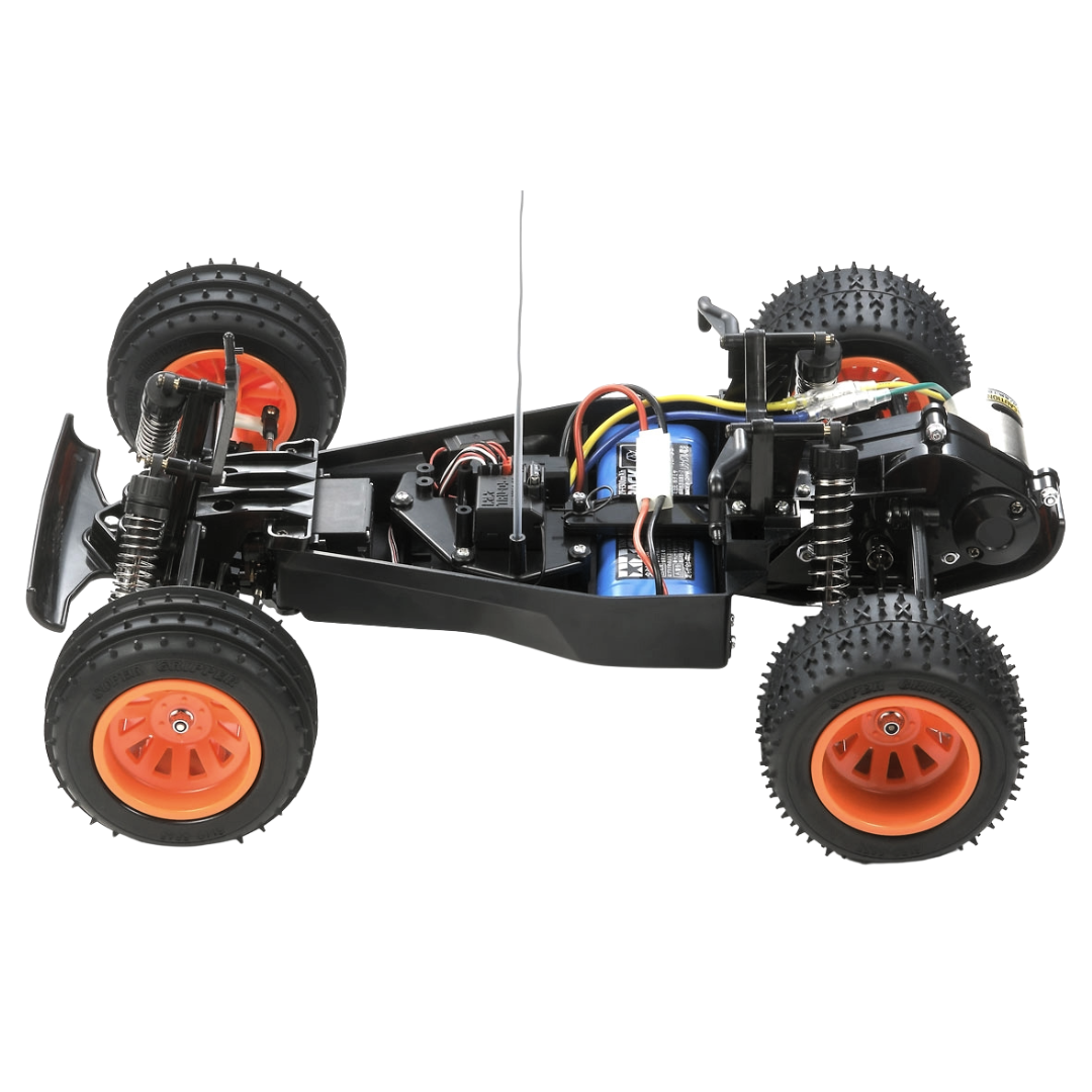 This tough, lightweight ABS bathtub chassis features a rear-mounted motor, rear-wheel drive layout. Fully-enclosed gearbox protects against dirt and debris and is equipped with differential gears to offer smooth cornering. 4-wheel independent double wishbone suspension is equipped with C.V.A. shock units and extremely durable monocoque-type lower arms. The front spiked tires feature three ribs for enhanced stability while the rear tires feature both spikes and an X-shaped tread pattern along the centre to ensure high levels of grip.