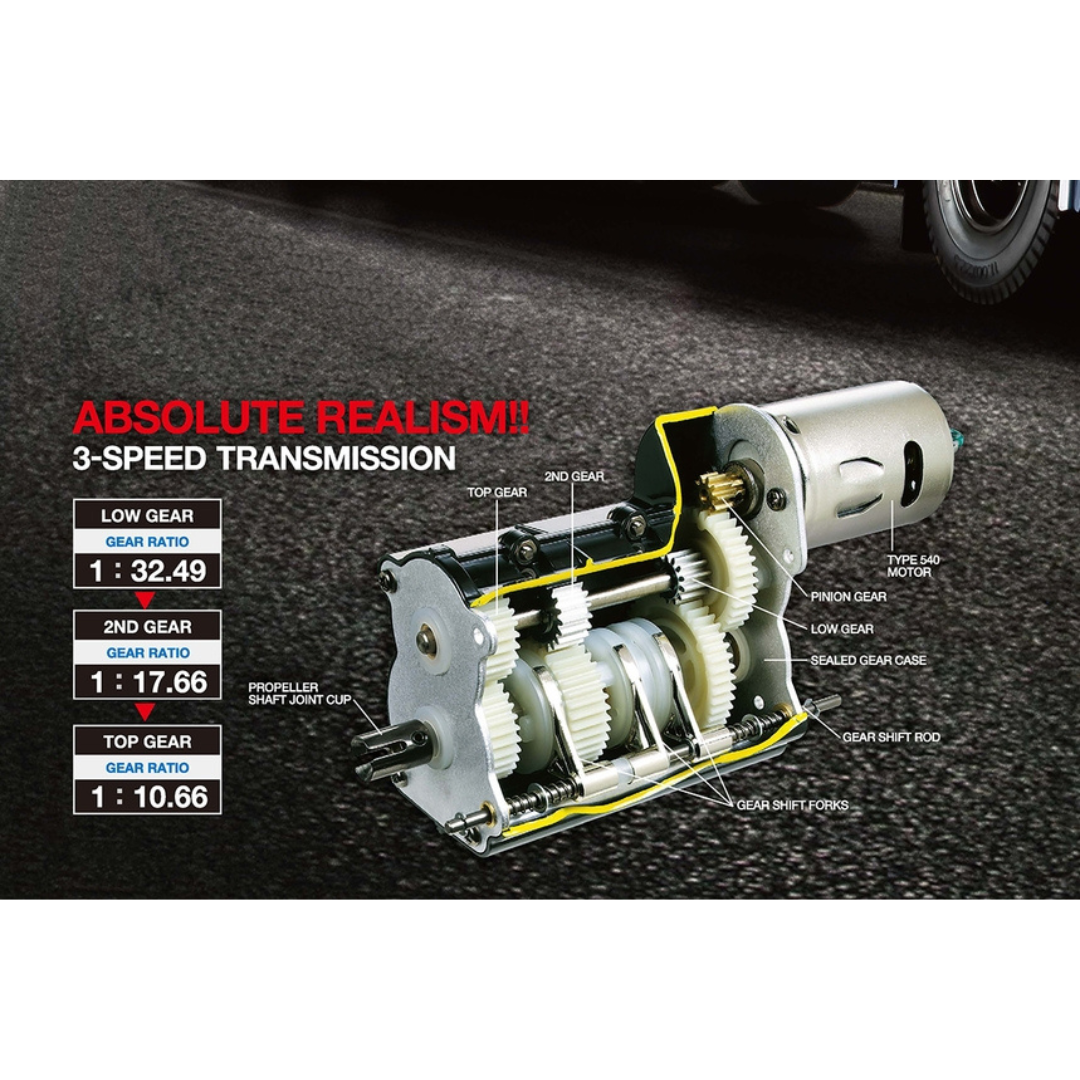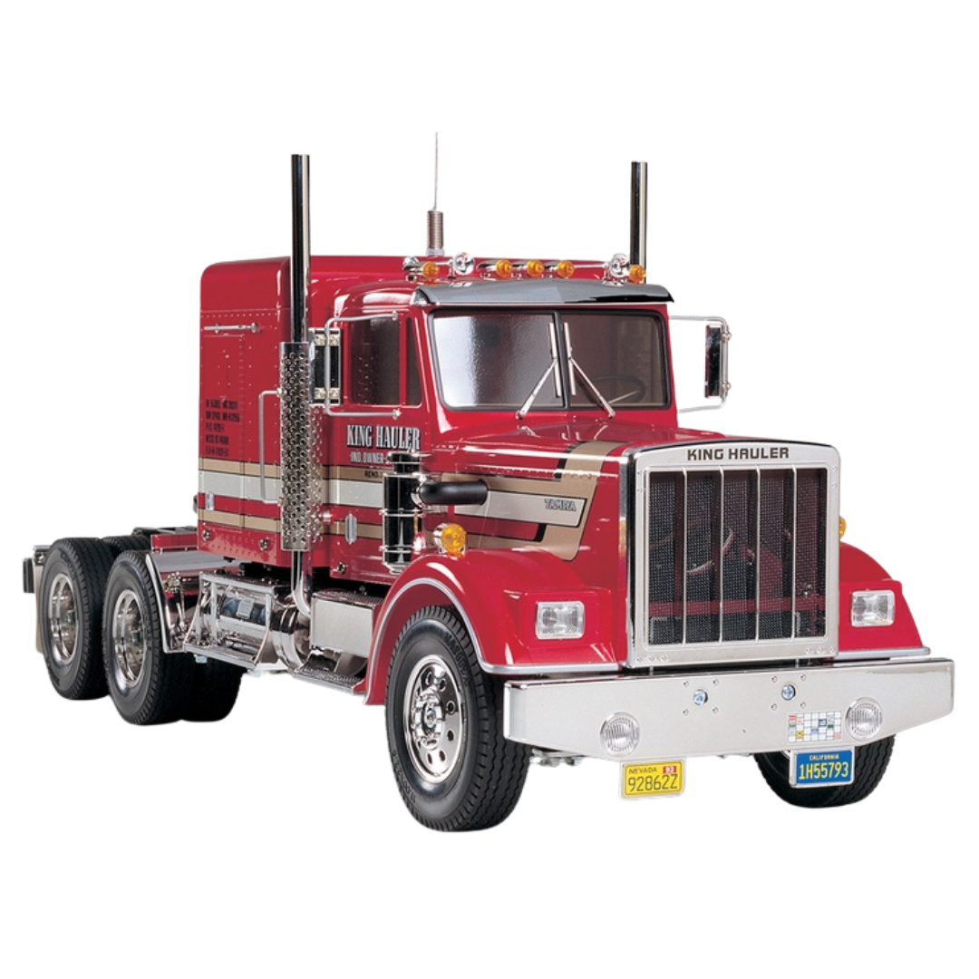 This assembly kit creates an R/C truck model known as the King Hauler. It features a front motor which provides power to the two driven rear axles via propeller shaft, and is equipped with a three-speed transmission. A realistic metal ladder frame utilizes metal leaf springs in the front and rear suspension, while the detailed and realistic body will certainly catch the eye. It's compatible with separately-sold trailers for some genuine 1/14 scale big rig hauling!