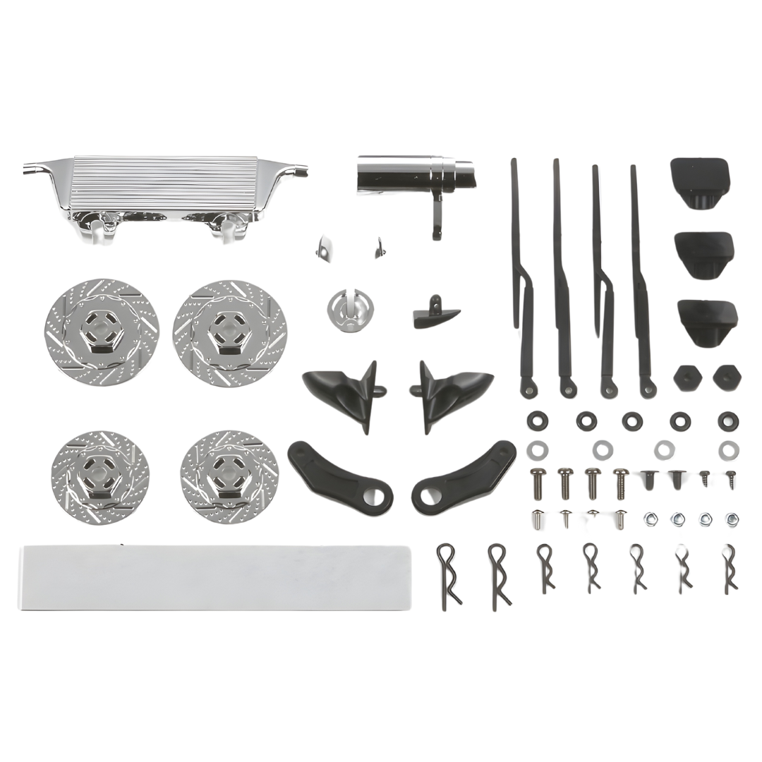 This set includes parts to depict front/rear wipers, side mirrors, muffler, intercooler, and brake discs to dress up and detail your 1/10 RC touring car body.
