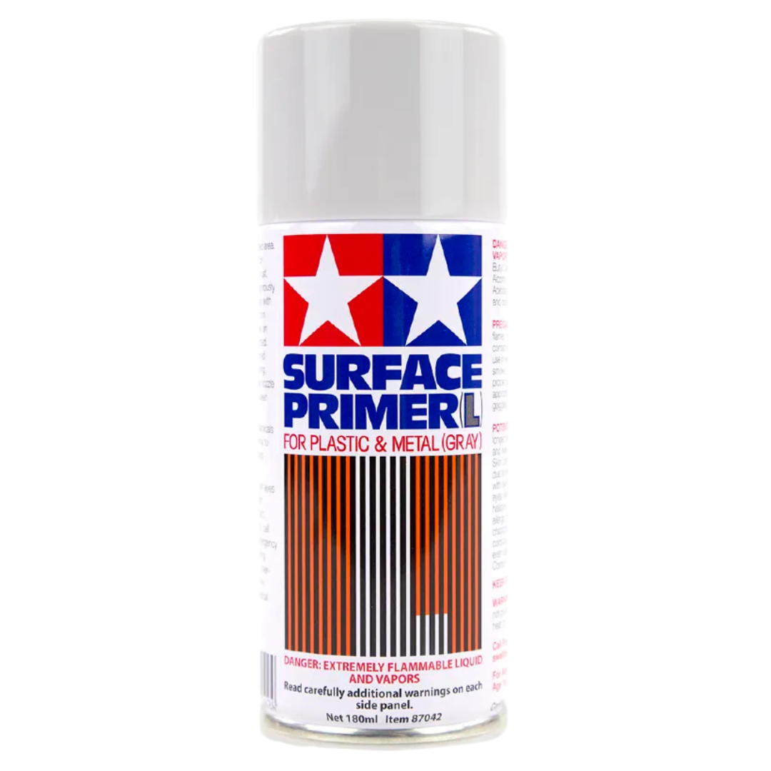 Tamiya Surface Primer L Spray prepares ABS, styrene, and metal model parts for painting, ensuring superior adhesion and a smooth base coat. The light grey primer is ideal for dark colour topcoats and can be wet sanded for an even finer finish.