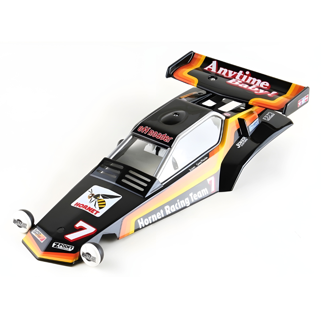 This genuine Tamiya finished and painted body with wing is a direct replacement for the 1/10 scale The Hornet RC buggy. Pre-finished for convenience, it allows you to refresh your model with an authentic factory look and fit.