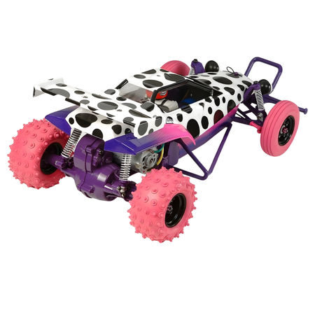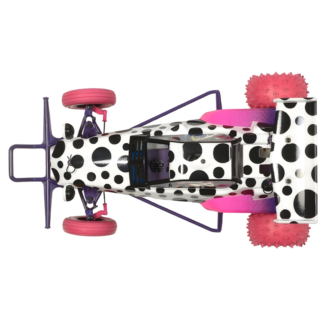 The legendary Hornet gets a bold new look with this special Jun Watanabe edition, featuring a playful black-spotted white body, vivid pink tires, and purple accents on the chassis, bumper, and side guards. White damper springs add a sleek touch, while pink 4mm wheel nuts bring in extra flair to complete the eye-catching design.
