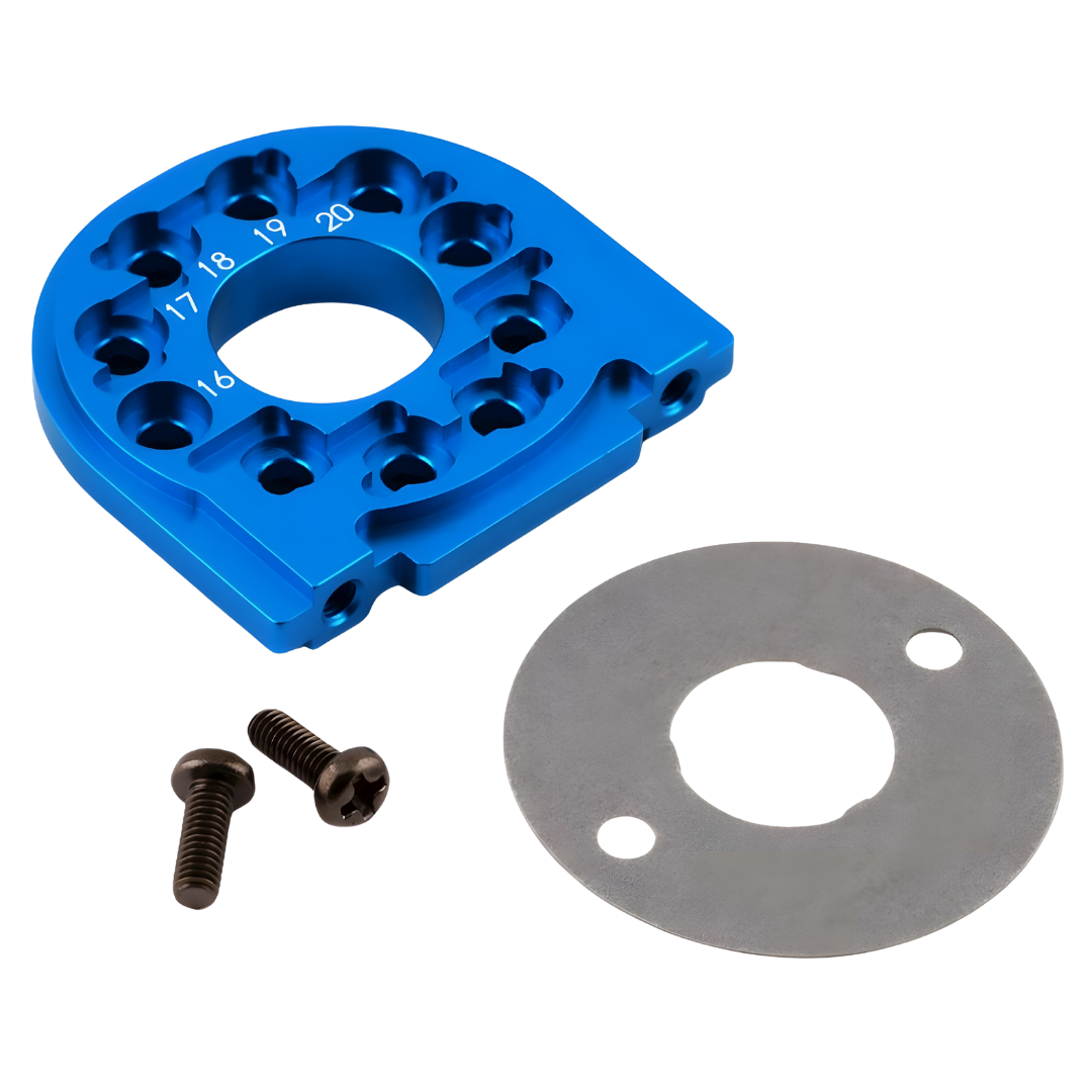 This precision lightweight aluminium motor mount replaces the kit standard plastic part to improve motor stability and cooling. It offers flexible installation options to fine-tune gearing for enhanced on-track performance.