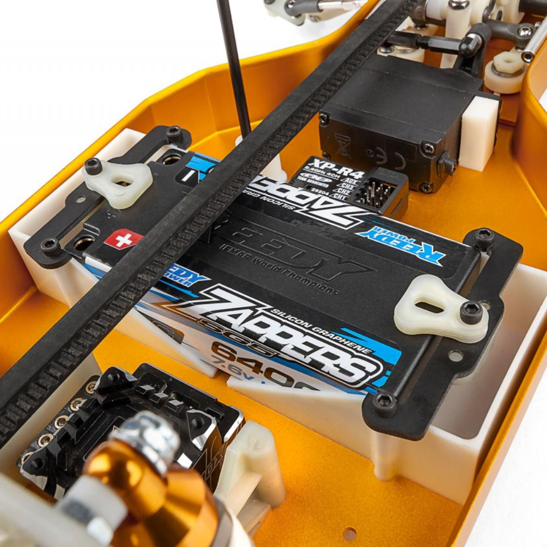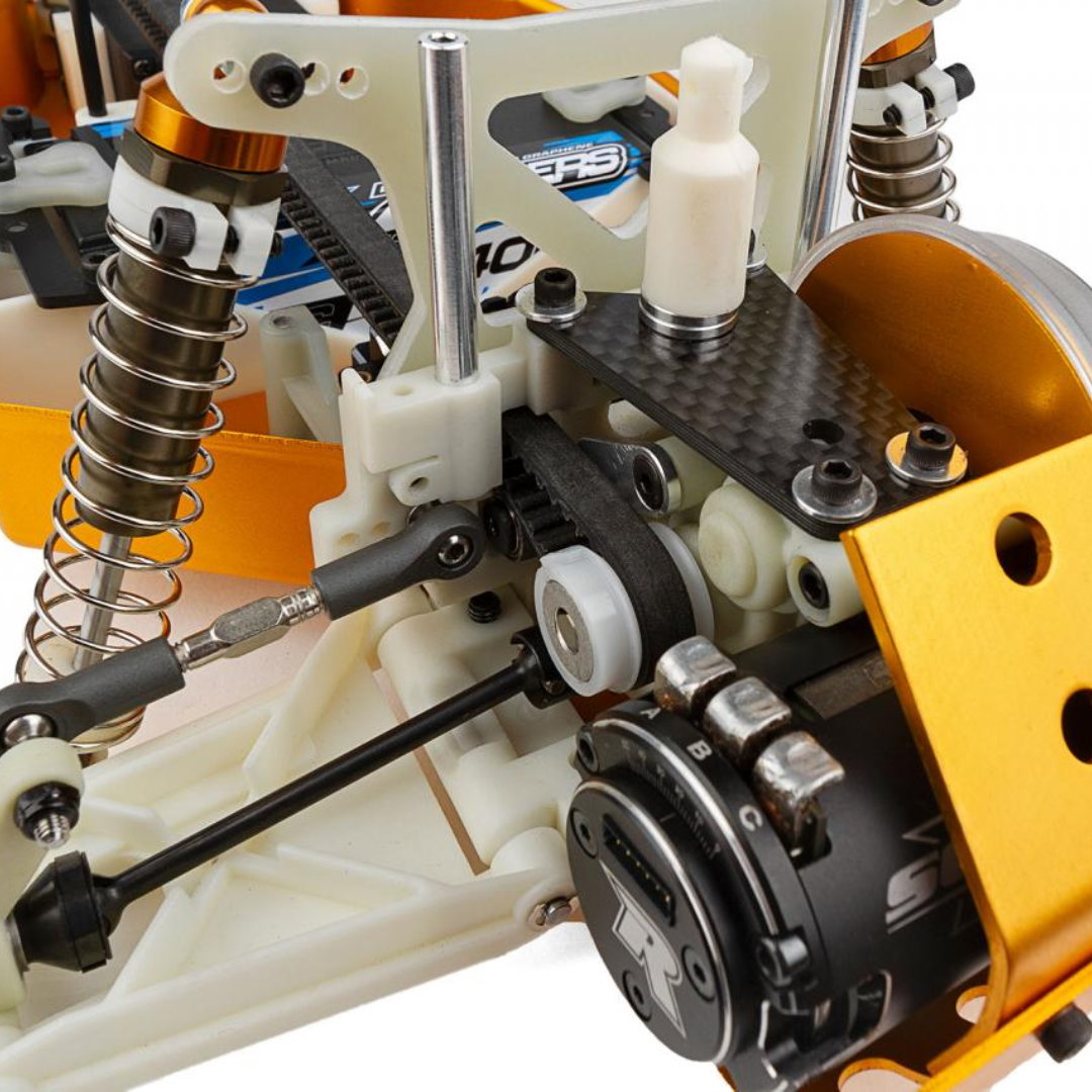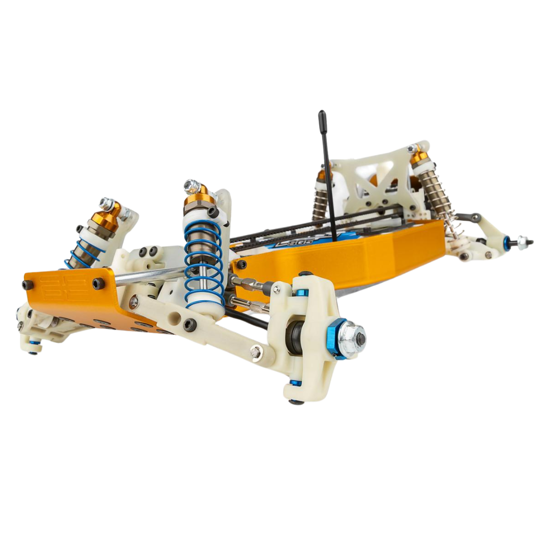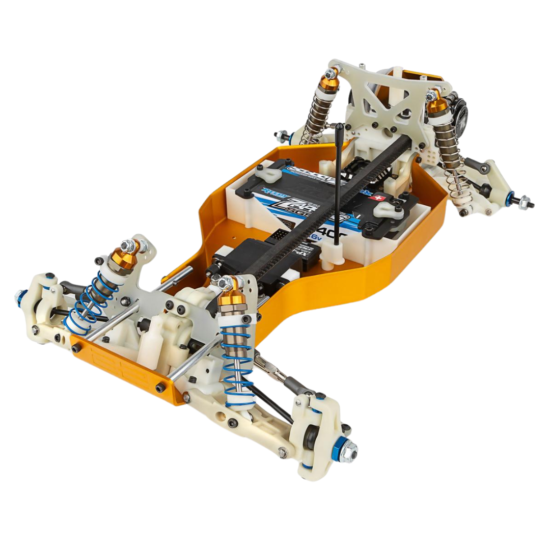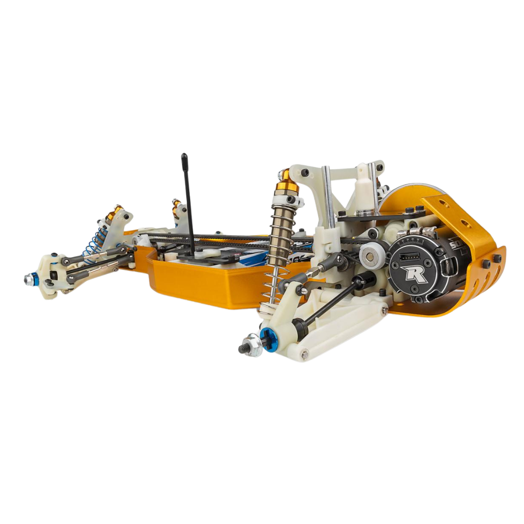 Blending vintage aesthetics with modern engineering, this kit offers the best of both worlds: the nostalgia of the classic RC10 combined with the improved handling, acceleration, and traction of a true four-wheel-drive racing machine. Built on a gold anodized 6061-T6 aluminum monocoque tub chassis, the RC10 4WD stays true to its championship-winning heritage while incorporating new refinements designed for today’s demanding race conditions.