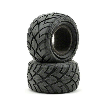 Traxxas tire set is rubber Anaconda tires with split x-pattern tread and foam inserts.