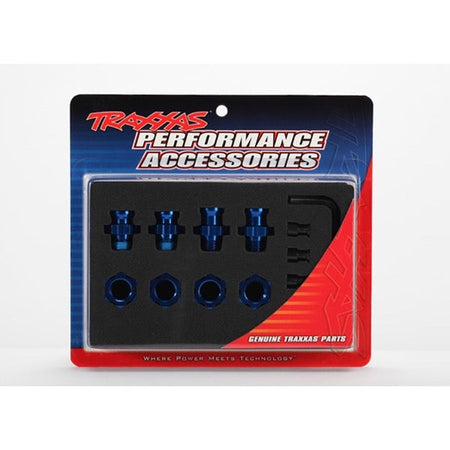 Traxxas' 17mm Hex Adapters make it easy to install a wide range of wheel and tire combinations on your Traxxas vehicle. Installation is simple using the included 5mm hex wrnech. The adapters' unique splined design offers maximum strength when used with Traxxas wheels, and also fits any standard 17mm hex wheel. Rugged machined-aluminum construction and vivid blue anodizing combine custom looks with maximum performance. The adapters are offered in complete sets to fully outfit one vehicle.
