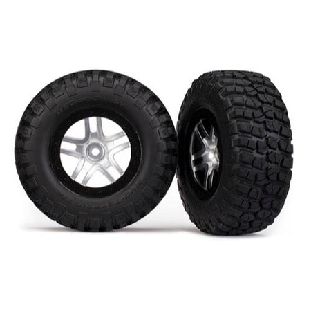 Pair of BFGoodrich® Mud-Terrain™ T/A® KM2 tires come pre-glued and mounted with foam inserts to satin-chrome Split-Spoke SCT wheels with black beadlock-style trim. Fits 12 mm hex, 2WD front only.