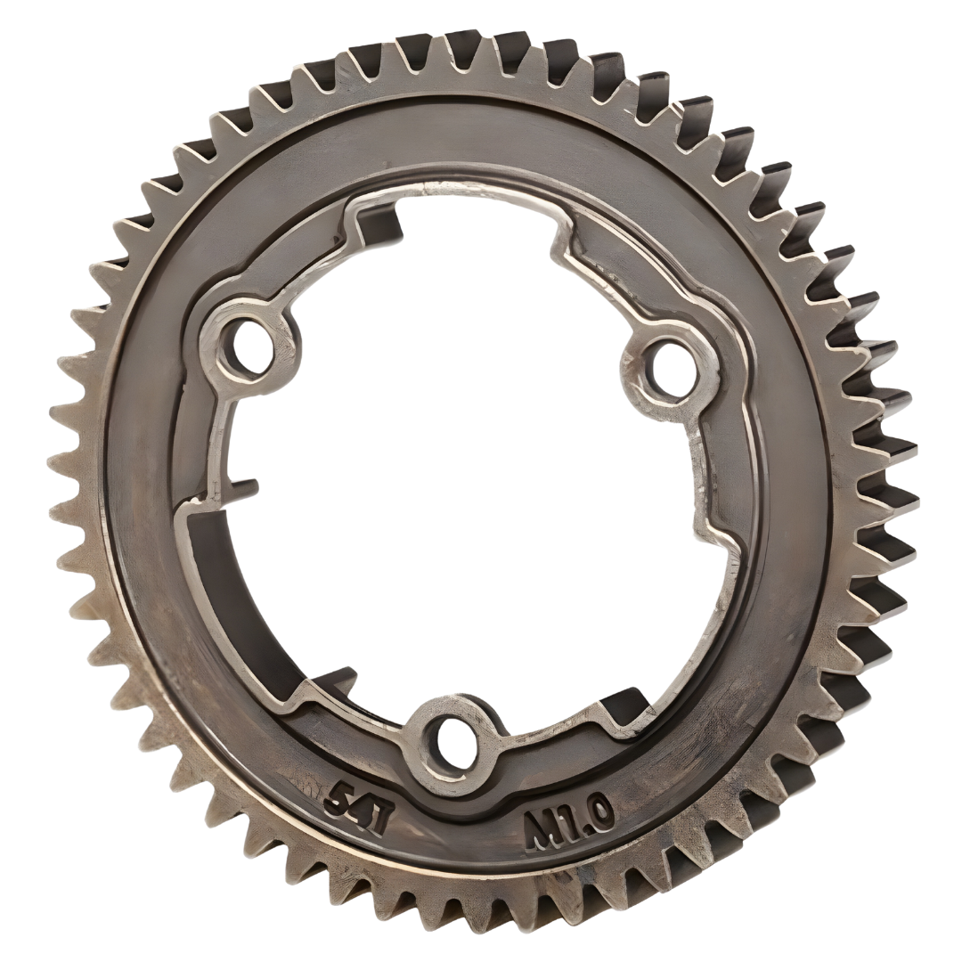 54-tooth spur gear (1.0 metric pitch) has steel teeth for superior power handling and durability. Traxxas spur gears let you fine-tune the performance of your Traxxas model. Changing gear ratios can help balance acceleration and top speed for different running conditions. Please consult your owner’s manual for more information on recommended gearing options for your specific model.