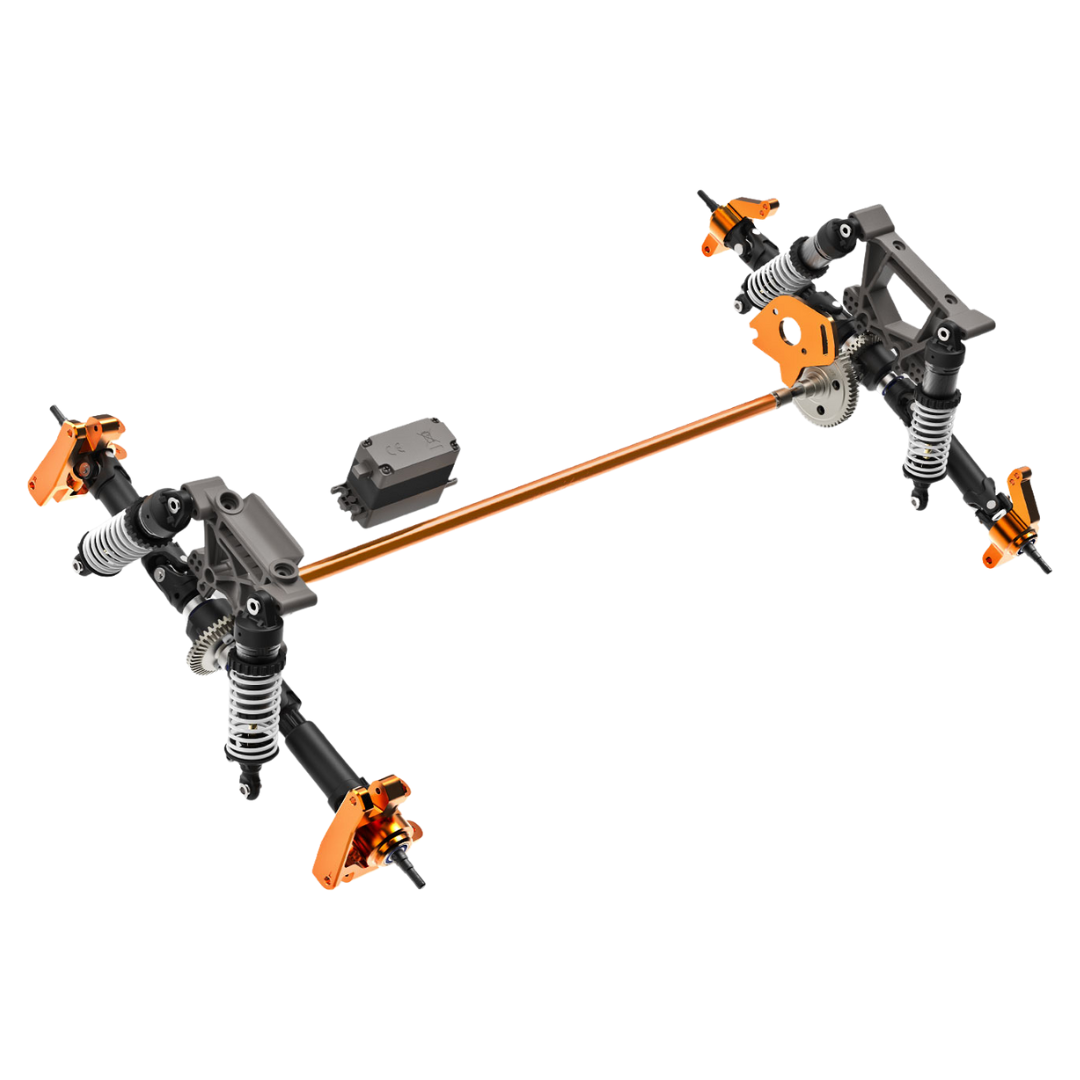 - Colour-matched 6061-T6 aluminium C-hubs, steering blocks, and rear hubs