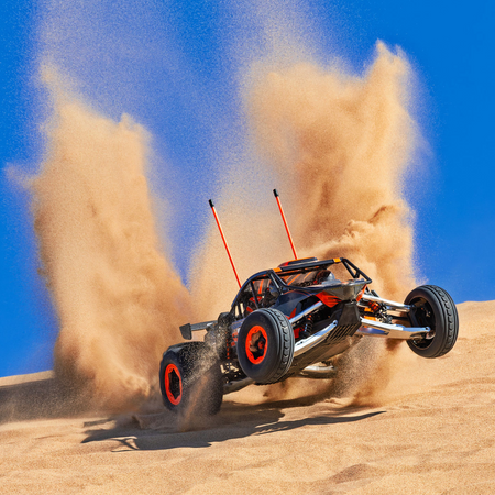 - Every detail of this Funco® Pro Scale® Sand Car reflects the full-sized counterpart, from its internal tube frame to its ultra-realistic scale body and precision details. The included color-matched whip lights with Flex-Tech™ mounts enhance the driving experience, providing both function and aesthetics. Belted paddle tyres complete the look while ensuring maximum forward bite in the sand.