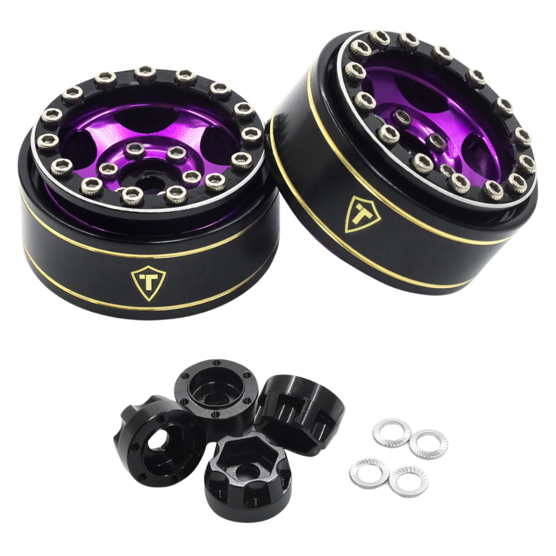 Enhance your RC crawler's performance with TREAL 1.0" Beadlock Wheels, engineered for 1/18 TRX4M and 1/24-scale models including SCX24, AX24, and FCX24. CNC-machined from aluminium with black-coated brass rings, these rims provide added weight for improved traction and stability across tough terrain.