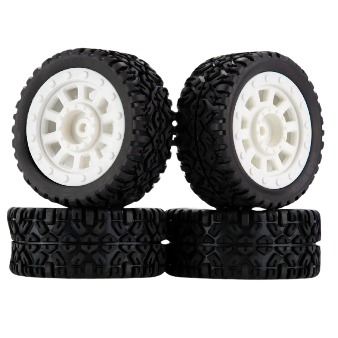 Set of four rally tyres pre-mounted on spoke-style white rims, designed for on-road RC vehicles. These 1.4-inch tyres offer optimal grip and performance for smooth surface driving.