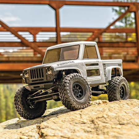 The VS4-10 Fordyce RTR is a retro inspired truck with the modern rugged durability that Vanquish Products is known for. Features the VFD Spec transmission, F10 Straight Axles, and Fordyce body with bedsides. Included is a full function digital 4 Channel VT-1 Transmitter with multiple model memory and end point adjustment, making the VS4-10 Fordyce RTR ready to be equipped with optional radio controlled accessories such as a winch, light controller or dig. Out of the box the VFD Spec comes with 6.5% OD powered by a 35T VM-1 Motor and VE-1 3S capable ESC. High quality stainless steel links are used throughout the Fordyce’s suspension, including larger diameter lower links for extra mass down low and a high clearance front tie rod that removes the bends from the link. The F10 straight axles are equipped with a one piece ring gear and spool paired with machined pinion gear. The chromoly universal axle shafts allow for 49 degrees of steering. Full ball bearings, metal transmission gears and 32P spur / pinion provide smooth and reliable performance when tackling the toughest terrain.