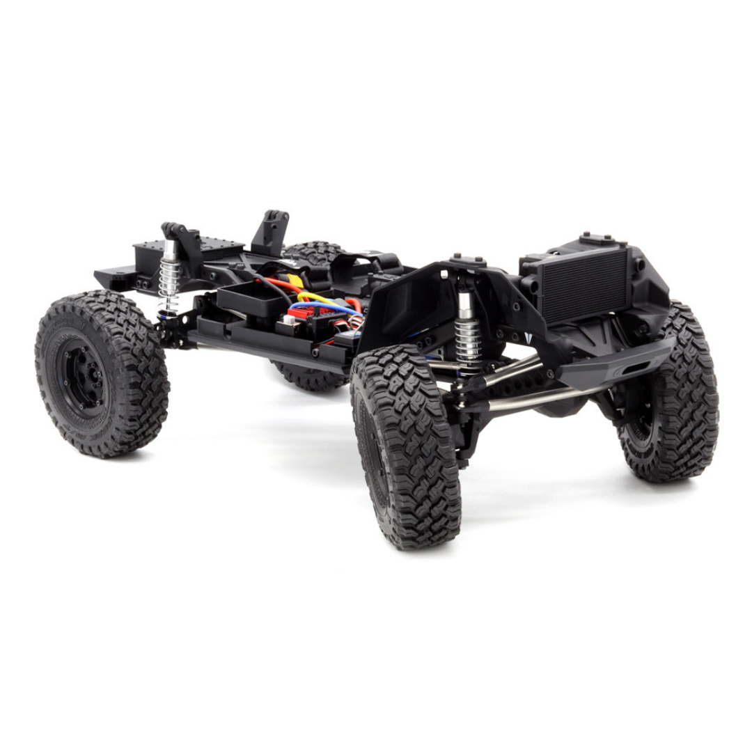 The VS4-10 Phoenix Portal RTR Phoenix Edition is equipped with the VFD Twin, incorporating Selectable Overdrive Shifting and 3-position dig ready (servos not included*) into one compact package. The molded F10 Portal Axles utilize a high clearance design which minimizes the size of the pumpkin and maximizes clearance around the C-hub and knuckle. Connecting the VFD Twin to the F10 Axles are the ISD10 driveshafts. The ISD10 Driveshafts have machined CV style joints at each end with molded splined shafts between them for smooth, quiet and efficient performance. The large 8mm bore S8E shocks included dual X-Ring cartridge and scale threaded caps with a sealed upper bleeder screw. S8E preload adjustment is a breeze with the threaded shock bodies and collars.