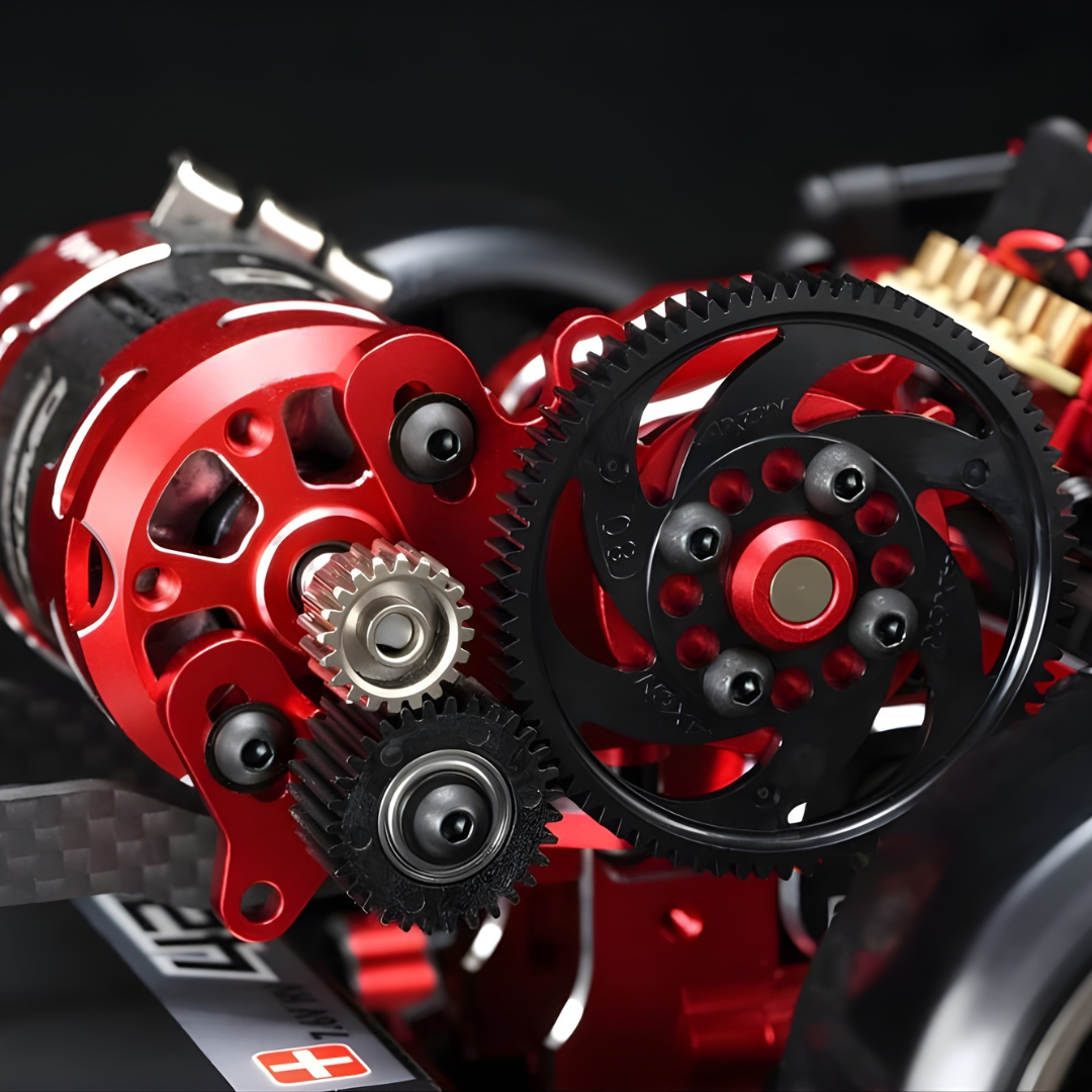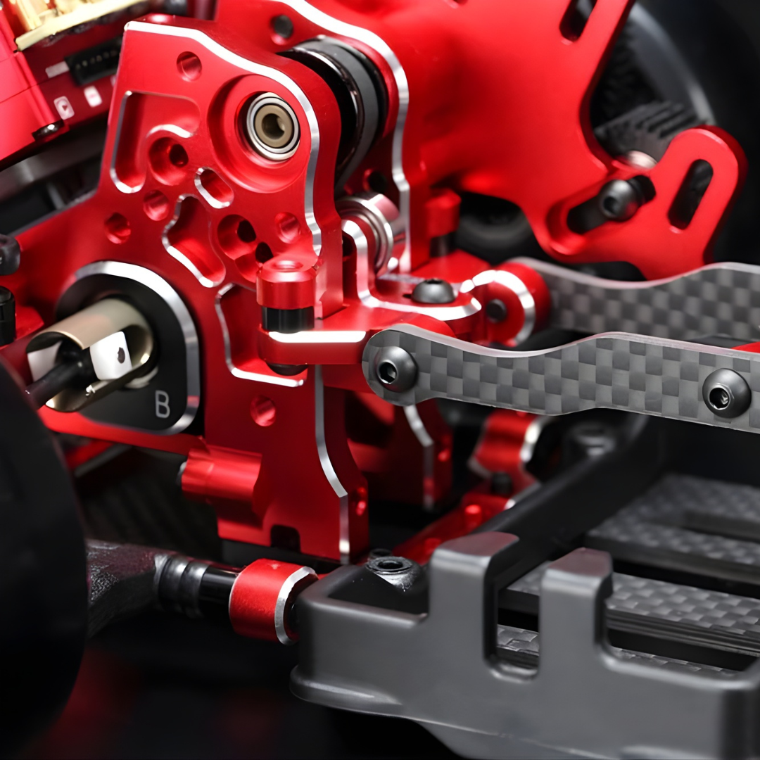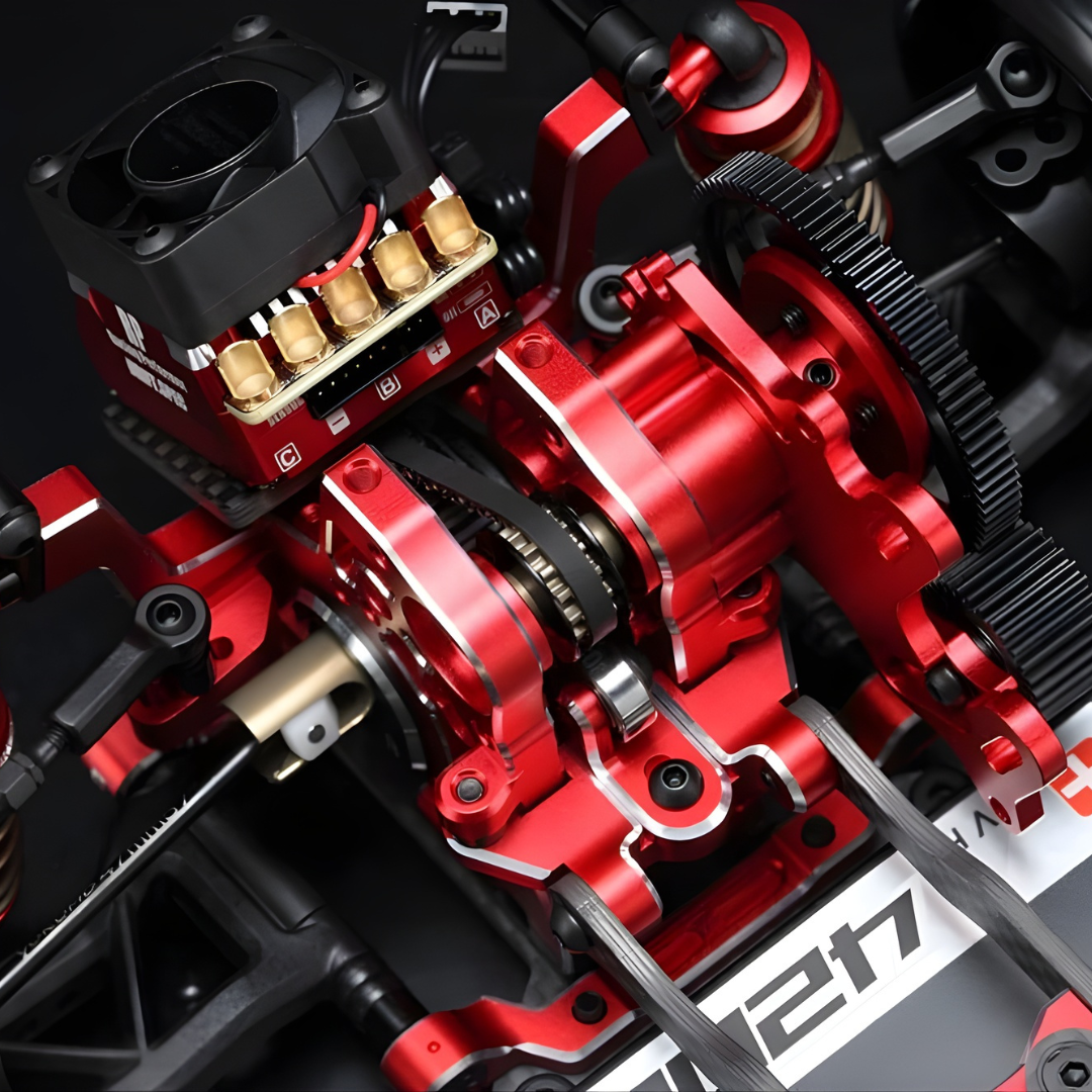 The Yokomo MD 3.0 is a high-performance competition drift chassis kit featuring a unique rear belt drive system for a smooth yet responsive drifting experience. This red limited-edition model combines aggressive aesthetics with precision handling.